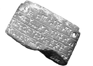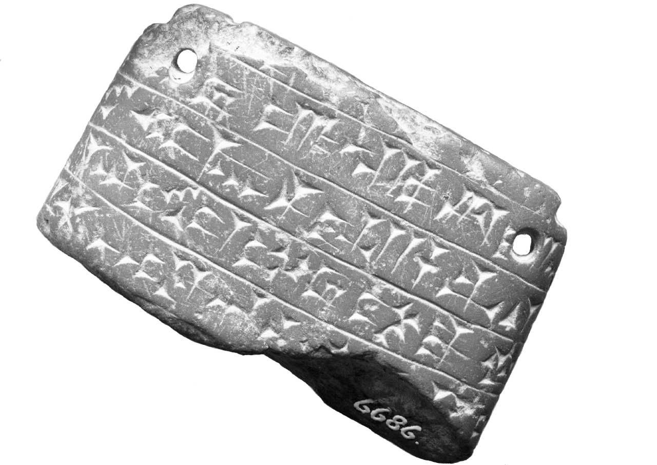 Assyrisk amulet af grå sten med billede af Labartu på forsiden og fire linjer kileskrift på bagsiden.