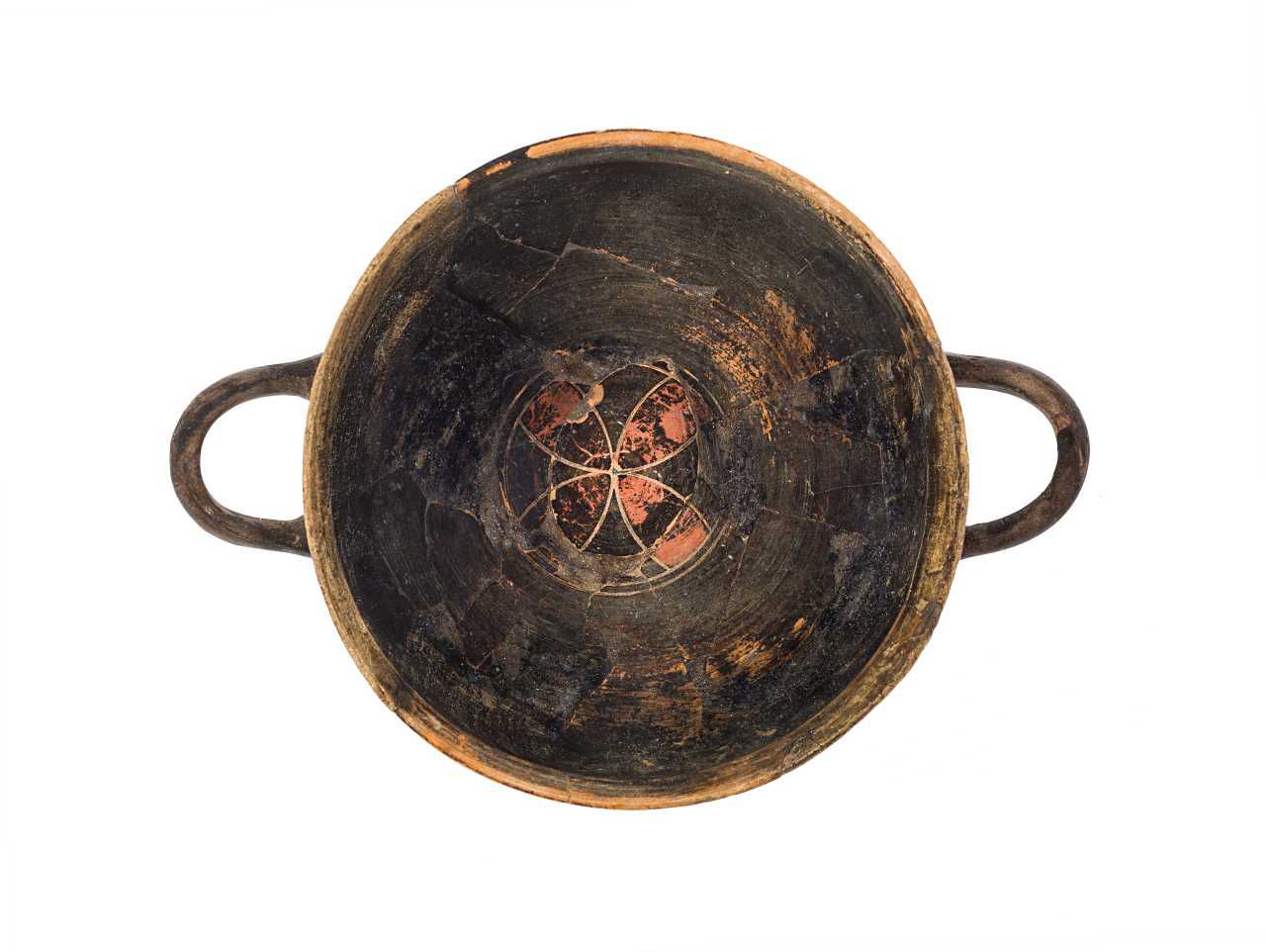 En såkaldt "Vroulia-skål". En drikkeskål, også kaldt kylix, med indridset dekoration dækket af purpurrød farve, en stil som var speciel for byen Vroulia på Rhodos.