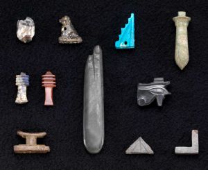 Amuletter i sten og fajance, overvejende fra mumiesvøb. Skarabæ i onyx med Horusfalk. Hund eller sjakal i prikket sten. Trappe (himmelstige) i fajance. Papyrus-søjle i feldspat. To djed-søjler i lapis lazuli og karneol. To-fingre i basalt (?), beskyttende amulet anbragt ved mumiens bughule. Udjatøje i osidian. Hovedstøtte i hæmatit. Lodbræt og retvinkel i hæmatit, som skulle retlede den døde.