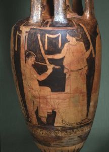 En bryllupsvase, en såkaldt loutrophor med tre hanke, med scener fra bryllupsceremonien. En række kvinder følger de nygifte fra brudens hjem til brudgommens, hvor de skal bo. Af Sabouroff-maleren.