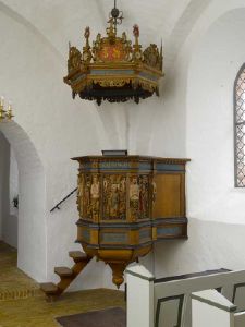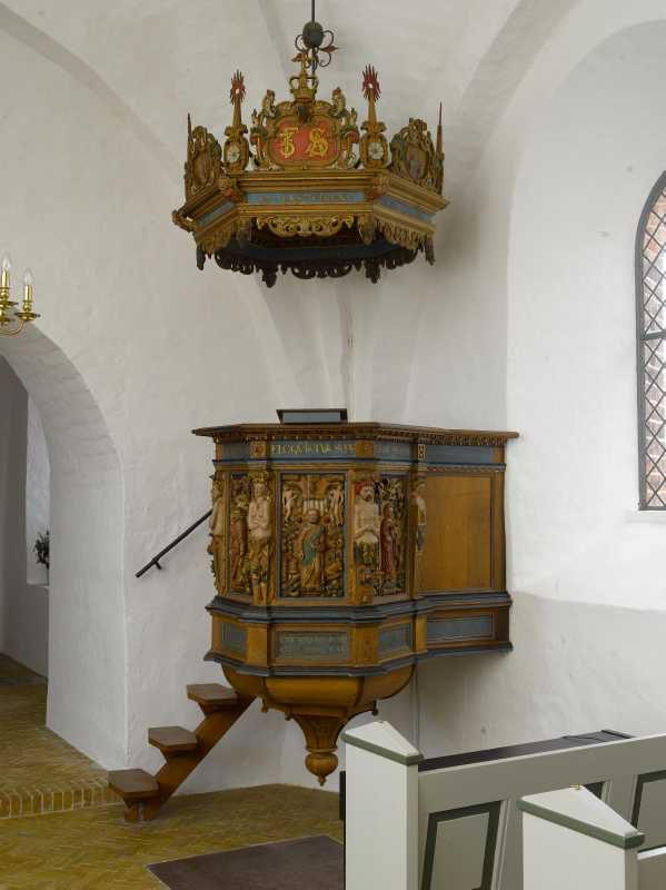Græsted Kirke. Prædikestol og lydhimmel efter kirkens istandsættelse og efter afstøvning og rensning.
