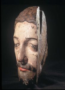 Flækket Kristushoved fra Roskilde Domkirkes korbuekrucifiks, der blev kasseret i begyndelsen af 1800-tallet. Hovedet indeholdt en lille silkepakke hvis indhold igen var et relikviekors, Roskildekorset (Kan ses andetsteds i Cumulus)