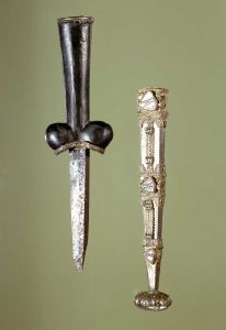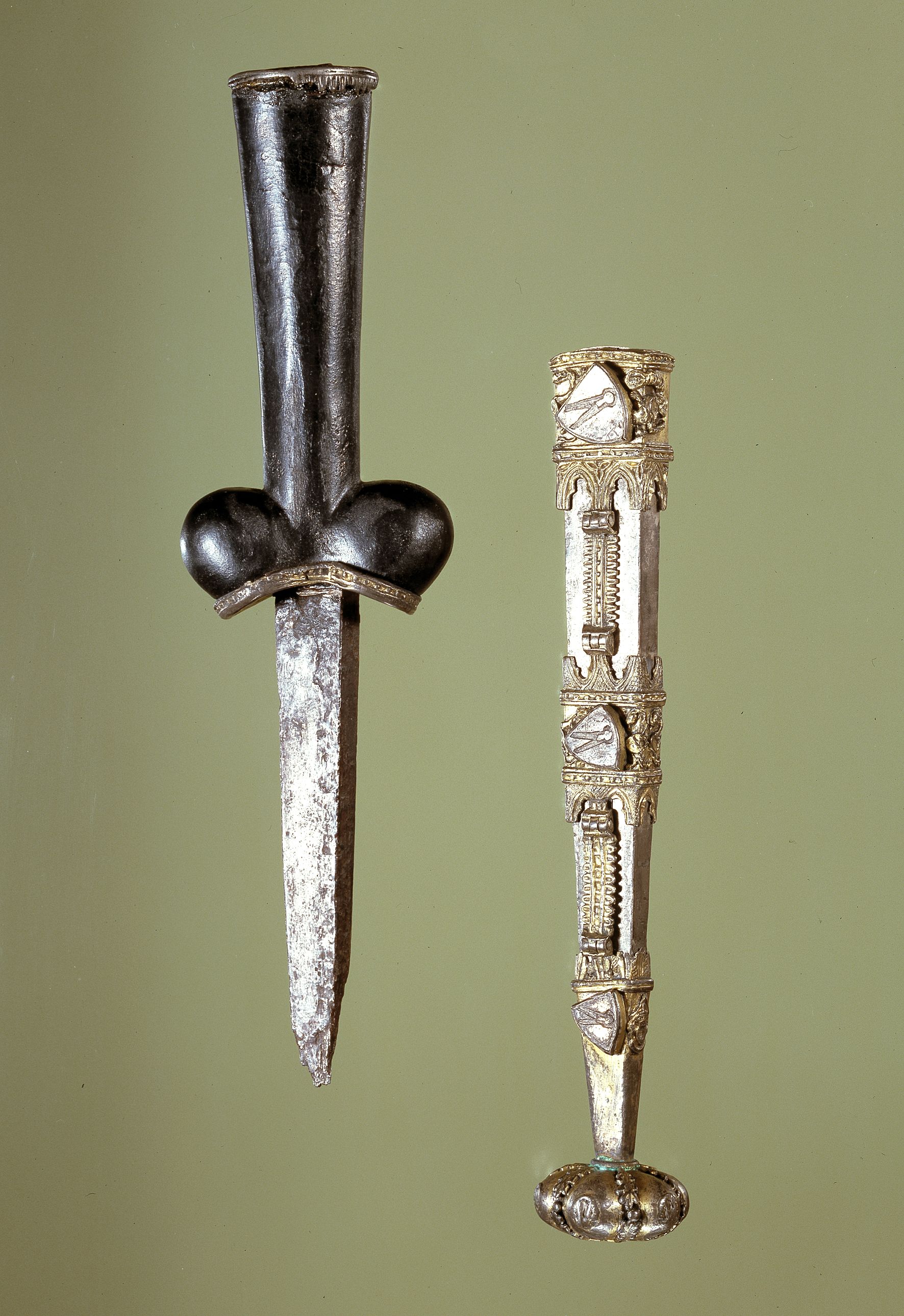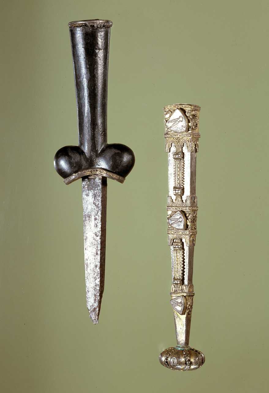 Nyredolk af jern med skede af delvis forgyldt sølv, forsynet med ornamentik og tre ens våbenskjolde med en uldsaks; et våben, der føres af flere danske adelsslægter. Dolken kan have tilhørt Saxe Petersen, der i 1320 var væbner og i 1330 blev slået til ridder. Fundet i Borremosen ved Remkolde, Sværdborg på Sjælland.