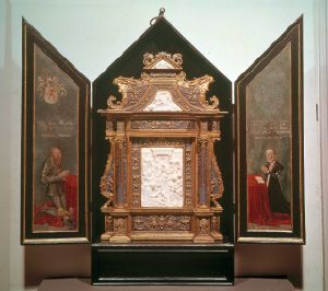 Husaltertavle, der har tilhørt adelsparret Herlof Trolle og Birgitte Gøye, som ses knælende i bøn, malet på skabsfløjene sammen med deres navne, våben og valgsprog. Alabast relieffet i midtfeltet er udført i den belgiske by Malines (Mechelen). Den viser den Hellige familie med Marias mor Anna sammen med sine tre mænd og alle efterkommerne. Det katolske motiv har åbenbart ikke anfægtet de lutherske ejere i Danmark.