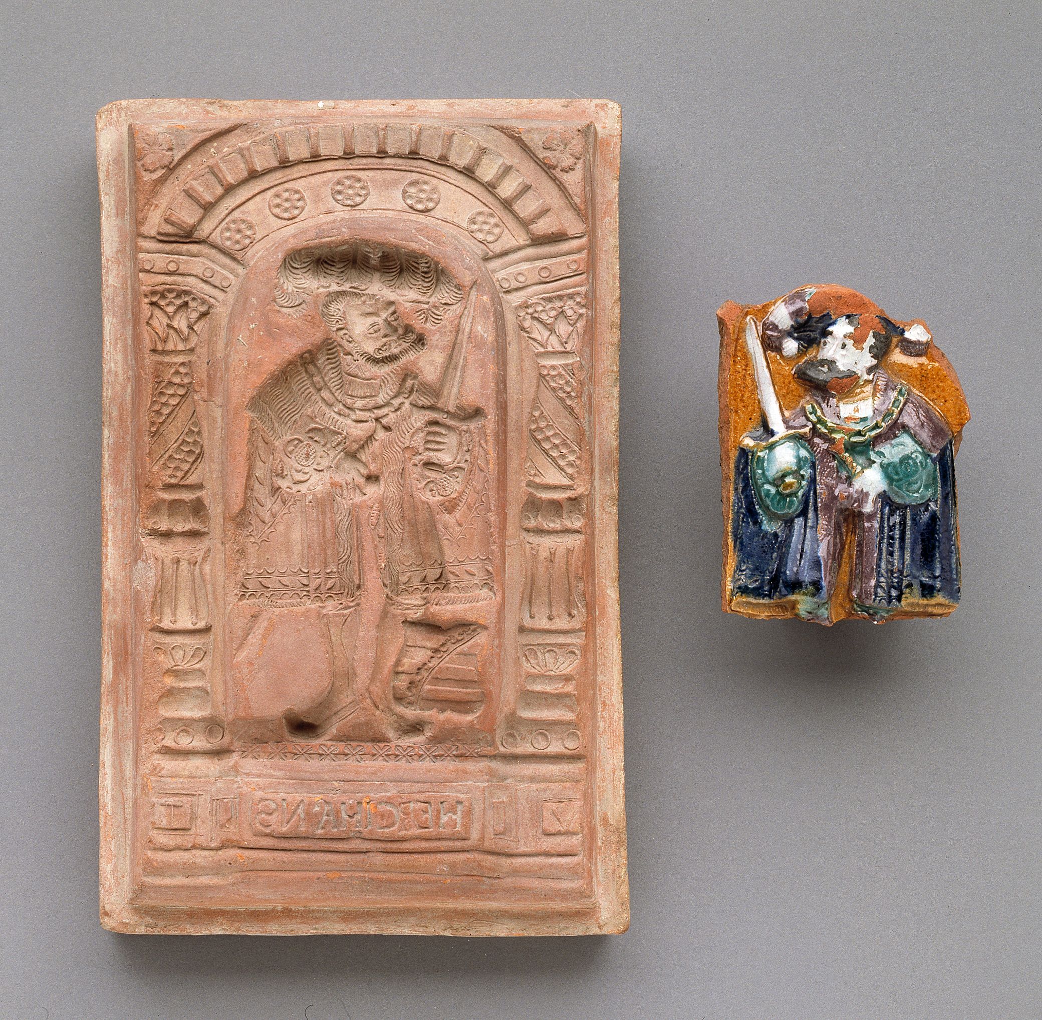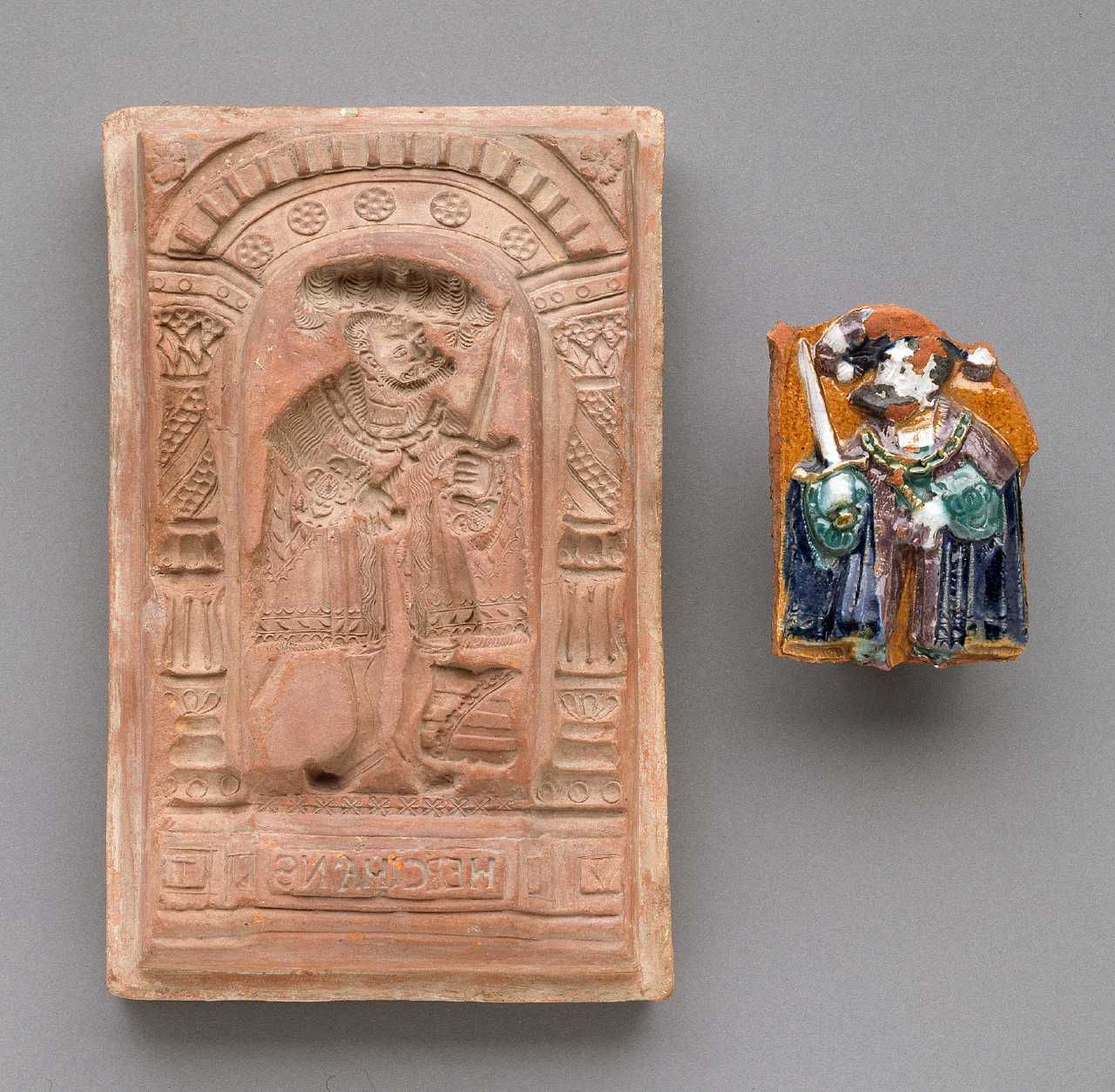 Form til fremstilling af ovnkakkel med hertug Johan Friedrich af Sachsen, samt fragment af kakkel med samme motiv. Københavnske jordfund.