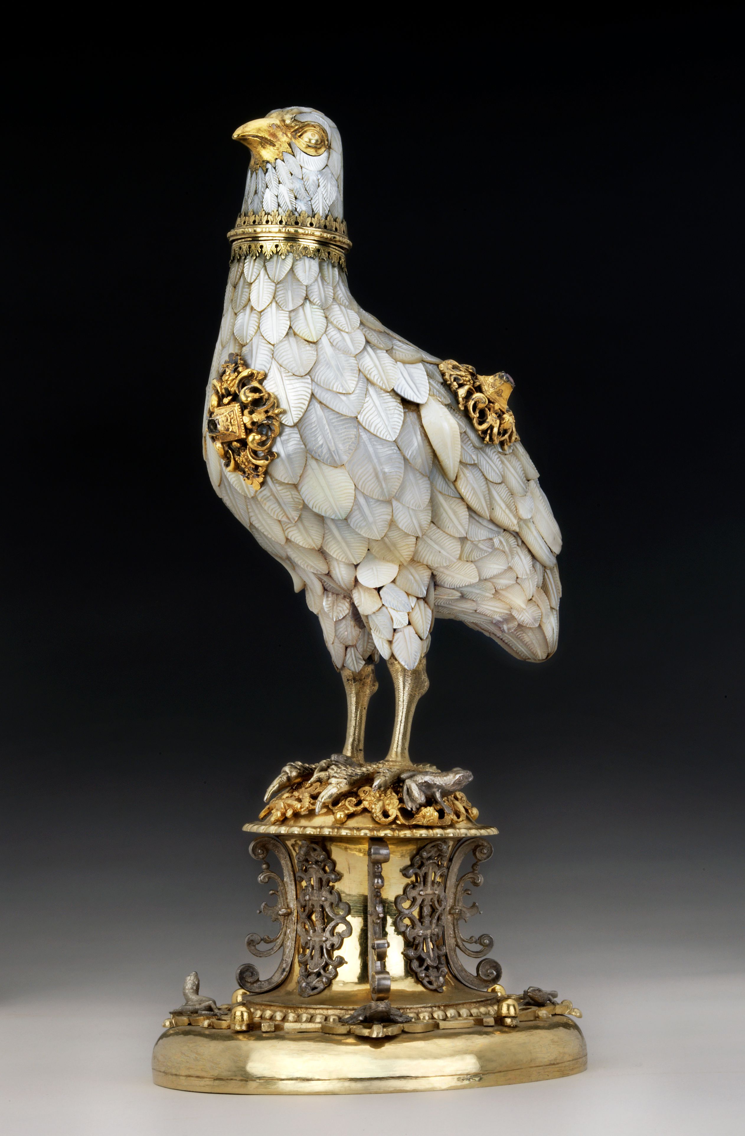 Drikkekar i form af fugl. Stående fugl med fjer af perlemor. På bryst og vinger en roset med indfattet granat (mangler på brystet). Ved fuglens fødder to frøer og et firben. Cirkulær, profileret fod, sølvforgyldt og med delvist forgyldte kartoucher og beslag. Herpå endnu to frøen og to firben. Stemplet "MB" og "N" formentlig for Meinrad Bauch d.æ. (mester i Nürnberg 1575, død 1623)