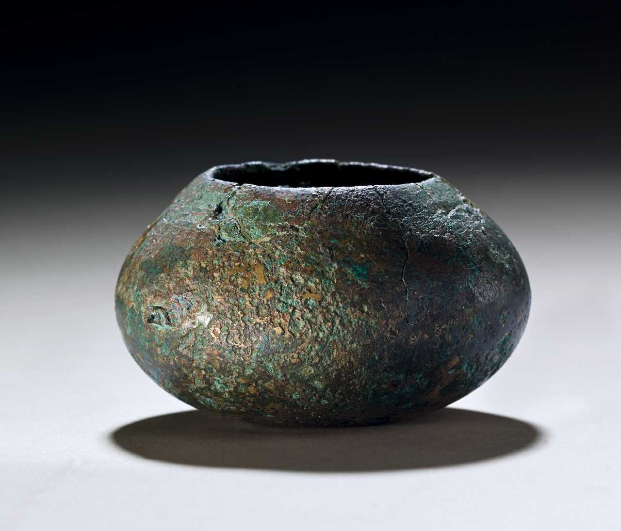 Bronzeskål. Højde: 6 cm. Bredde: 9,9 cm. Mundingsdiameter: 5,3 cm. Jævnt rundet profil, snæver munding, bunden let affladet. På det bredeste sted, 3 cm. over bunden, er der en knop, antagelig rester af en hank 5 cm over bunden. På den stærkt indadbøjede del, er der er sikkert, men ret utydeligt vandret mærke som efter hankefæste. Dette sidder delvist over knoppen, og er 2,5 cm. langt og 0,2 cm. bredt. Fundet i grav IV på Fyrkat udenfor Hobro i Jylland.