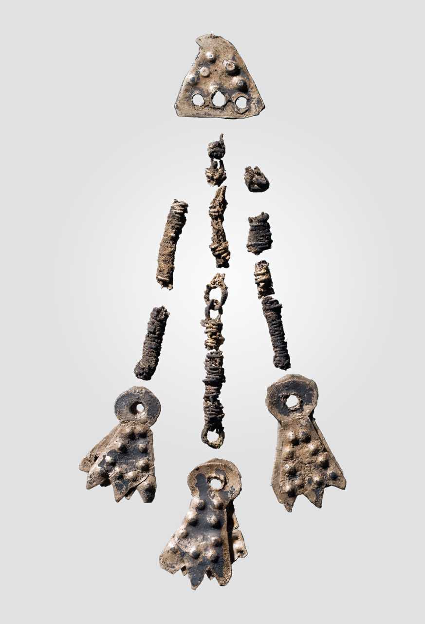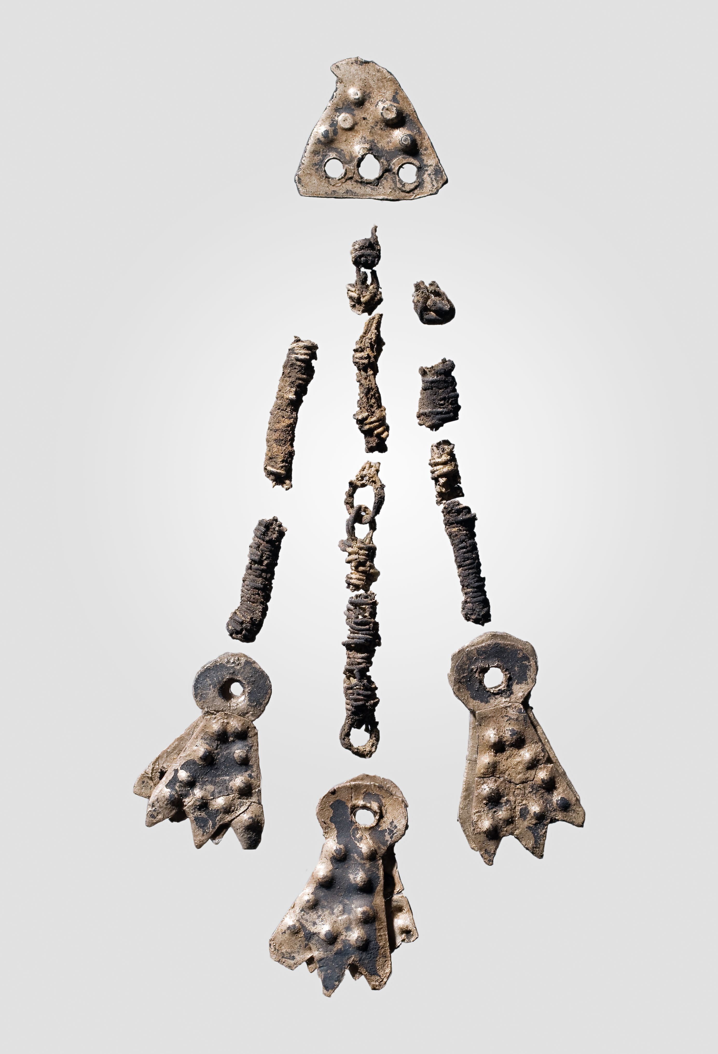Fragmenter af raslesmykke af stemplede sølvblikplader i tynde kæder. Længde: 6,4 cm. Øverst et trekantet stykke med rest af øsken. Heri 4-5 islåede punktstempler og i en bredside tre huller, antageligt til fæstelse af kæderne, der har holdt tre par rasleplader. Raslepladerne består af ens udklippede sølvblikfigurer, parvis anbragt med bagsiderne mod hinanden, så de islåede stempler træder frem på alle synlige sider. Kæderne består af ca. 0,5 cm. lange kædeled, antageligt dannet ved at en meget tynd sølvtråd er lagt sammen flere gange i kædens længderetning og til slut vundet rundt heromkring. Fundet i grav IV på Fyrkat udenfor Hobro i Jylland.