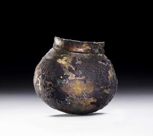 Bronzegenstand, rund og rundbundet med lodret krave. Højde: 3,8 cm. Bredde: 4,3 cm. Kravens højde: 0,5 cm. Stykket er muligvis knappen på en stok eller kølle.Fundet i grav IV på Fyrkat udenfor Hobro i Jylland.