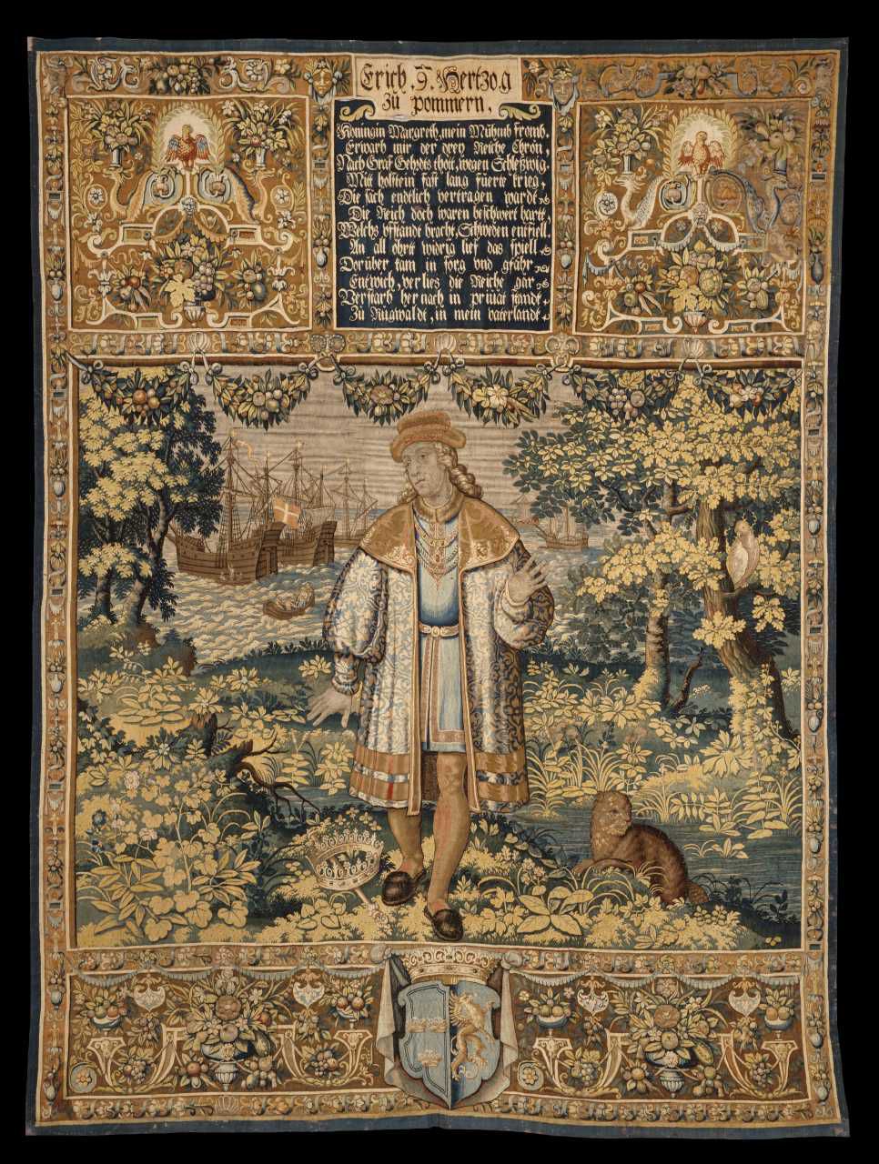Tapetet her (Nationalmuseet) forestiller Erik af Pommern (1412-39). Kongen er fremstillet lidt "opgivende" med den venstre hånd/arm let henkastet slående ud, mens scepter og krone er anbragt omhyggeligt i græsset ved siden af. Måske symbolsk for hans skæbne, idet han blev afsat/abdicerede og drog til Gotland, hvor han ernærede sig ved sørøveri, for til sidst at ende i Pommern. På havet i baggrunden ligger en flåde - muligvis på vej til Gotland.