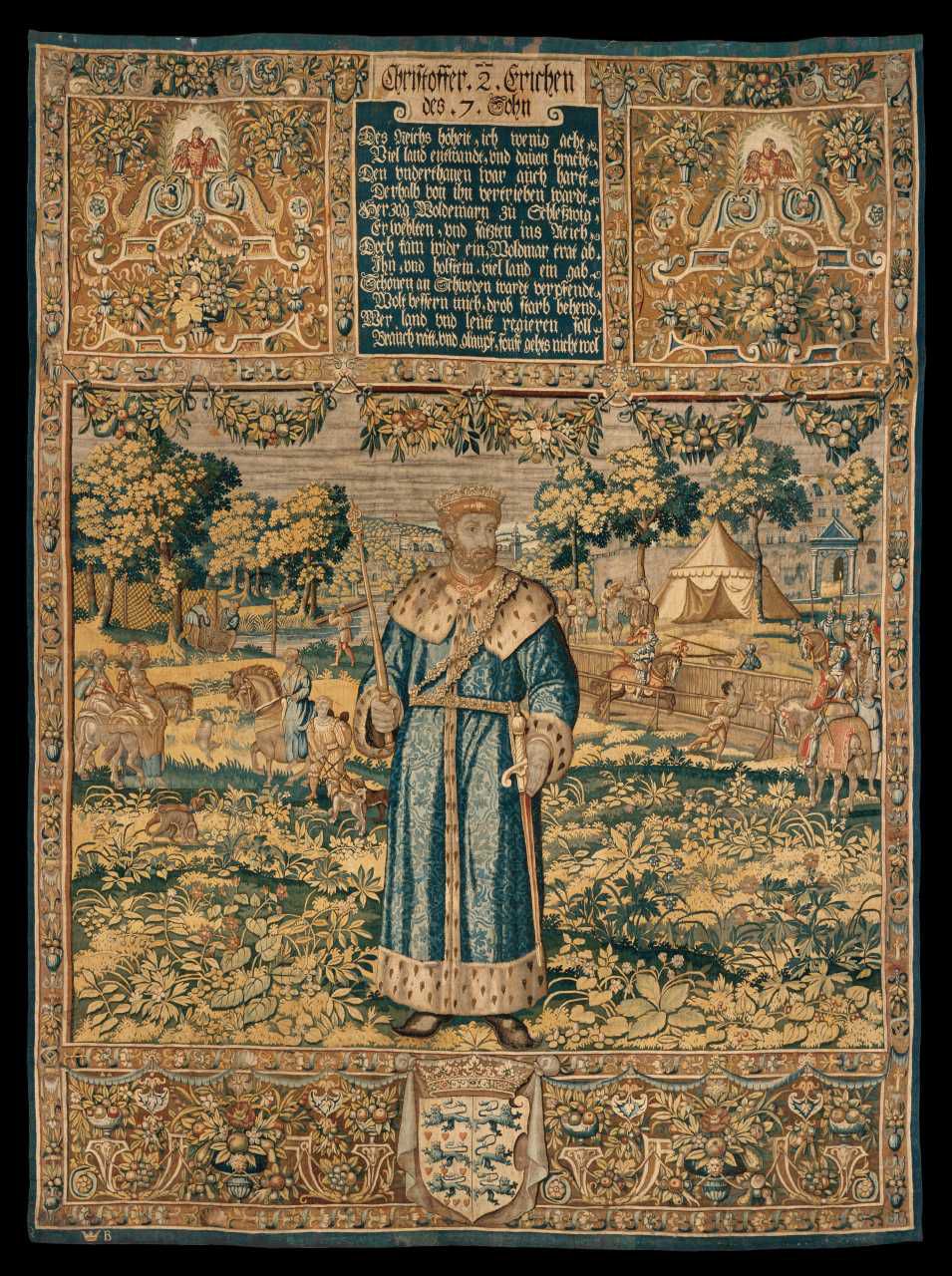 Tapetet her (udstillet på Kronborg) forestiller Christoffer 2. (1319-32). Den kronede konge, der har fuldskæg, står med scepter i sin højre hånd, mens den venstre hånd holder om sværdets bøjede parérstang. I venstre side forberedes en jagt; net opsættes, og en herre rider hen imod to damer til hest, som skal deltage i jagten. Også hunde er med. I højre side foregår en turnering, hvor man kan se trompeterer til hest, ventende ryttere samt to ryttere i kamp mod hinanden med lanser, kun adskilt af et solidt rækværk. Bagved turneringen ses et tomt telt (til tilskuere) og igen bagved dette en ringmur, der skærmer et slot. Helt i baggrunden ses to spir til endnu et slot, som leder tankerne hen på Kronborg.