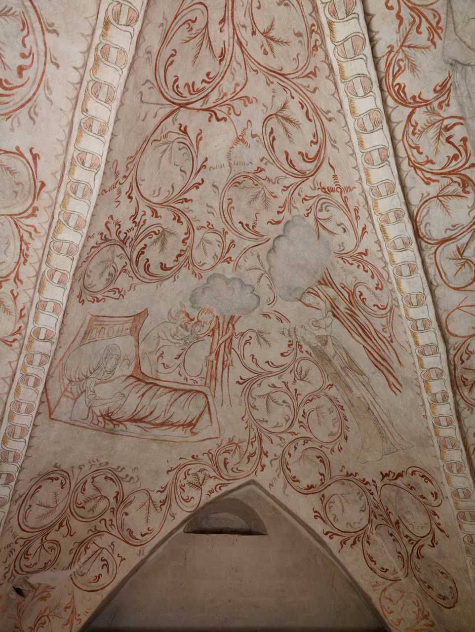 Efter konservering fra stillads, - enkelte detaljer samt baggrunde er ikke afsluttet. Skibets 2. fag, sydkappen. Laurentius' fødsel og barndom, helhed.