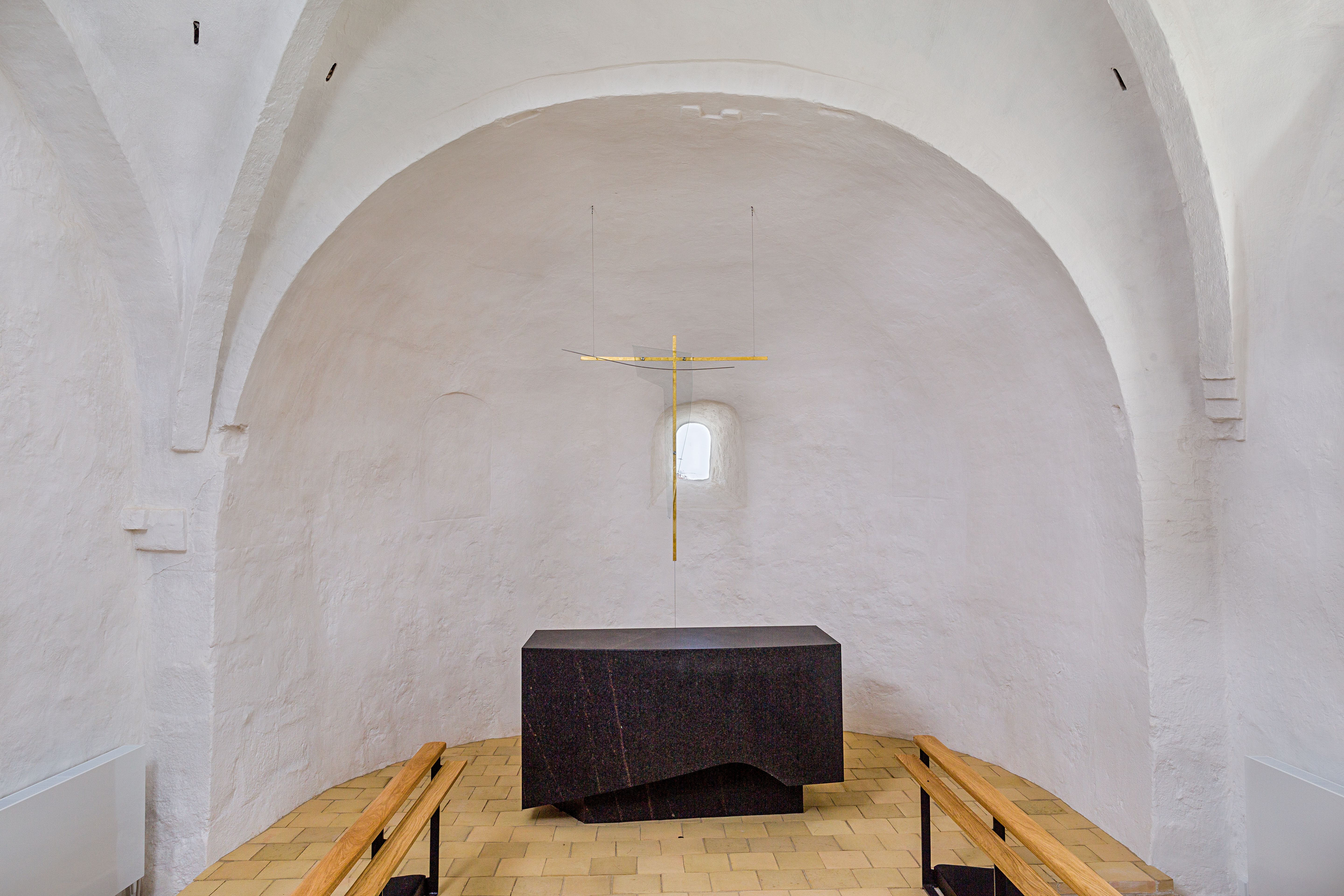 Koret i Stenløse Kirke med Kirsten Lockenwitz alterbord og -prydelse fra 2015.