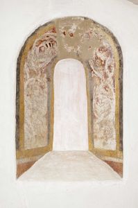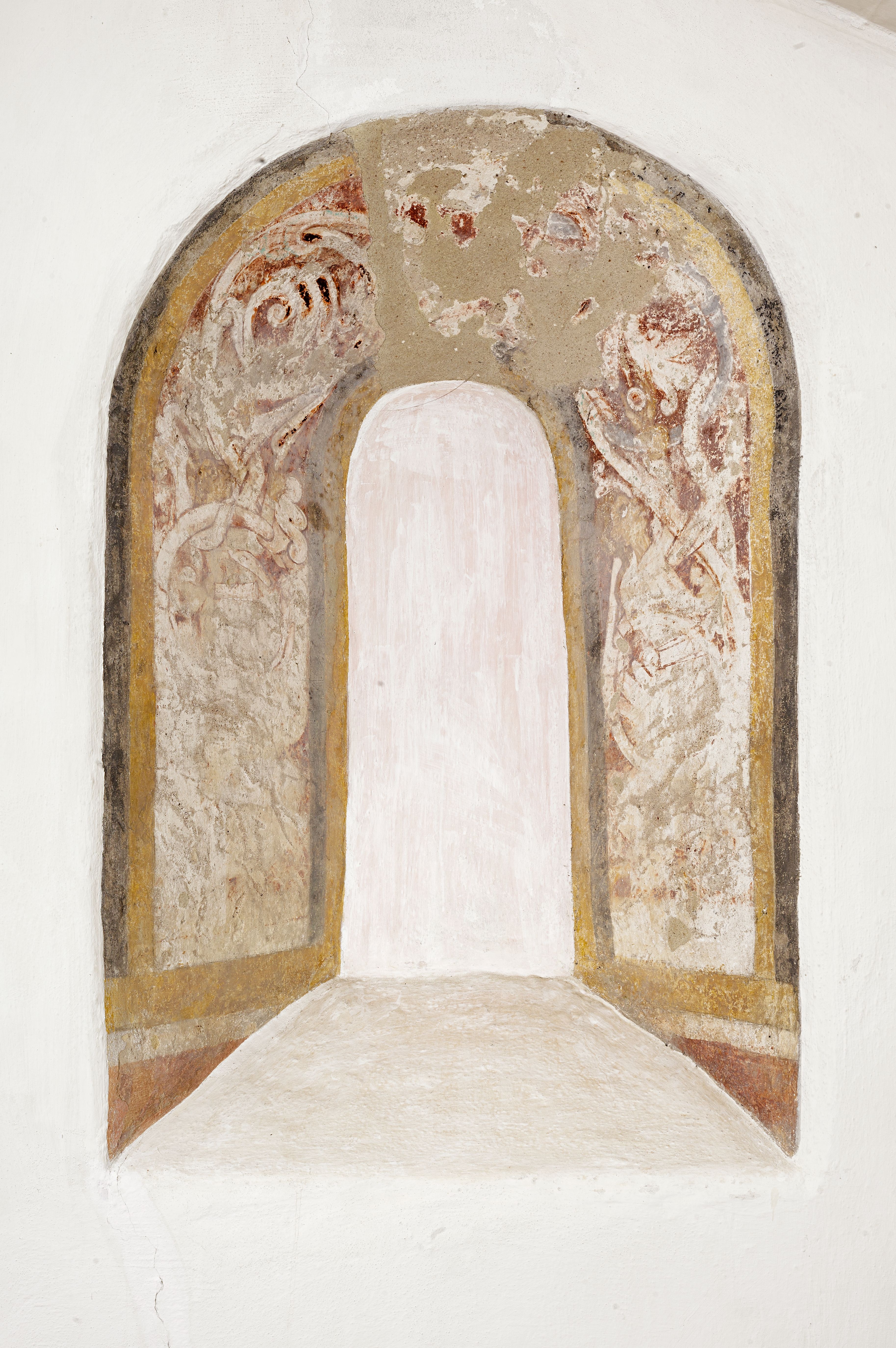 Stenderup kirke - Kalkmaleri med beboet ranke i korets nordvindue, o. 1150-1175
