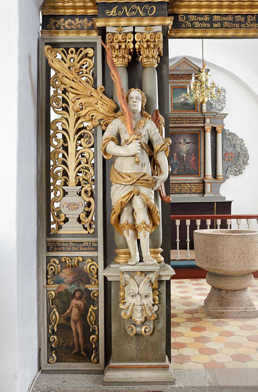 Danmarks Kirker, Vejle Amt, Hæfte 17, fig. 30 Udsnit af korskranke fra 1704. Kerub med flammesværd.