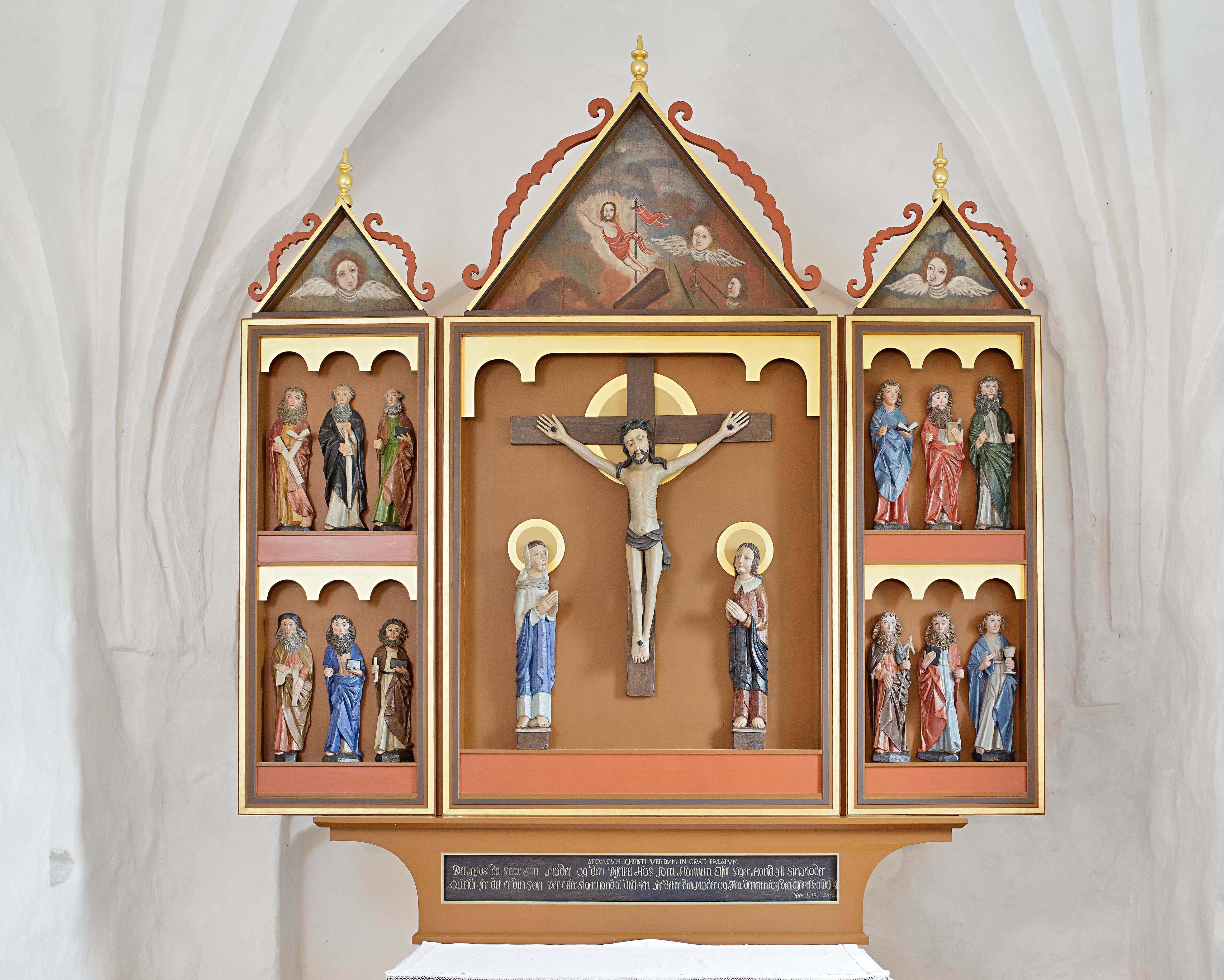 Altertavle fra 1957-1959 med middelalderlige sidefigurer og krucifiksgruppe, antagelig fra 1729. Omdannet i 1995-1996.