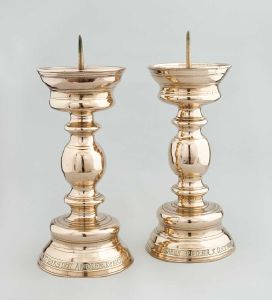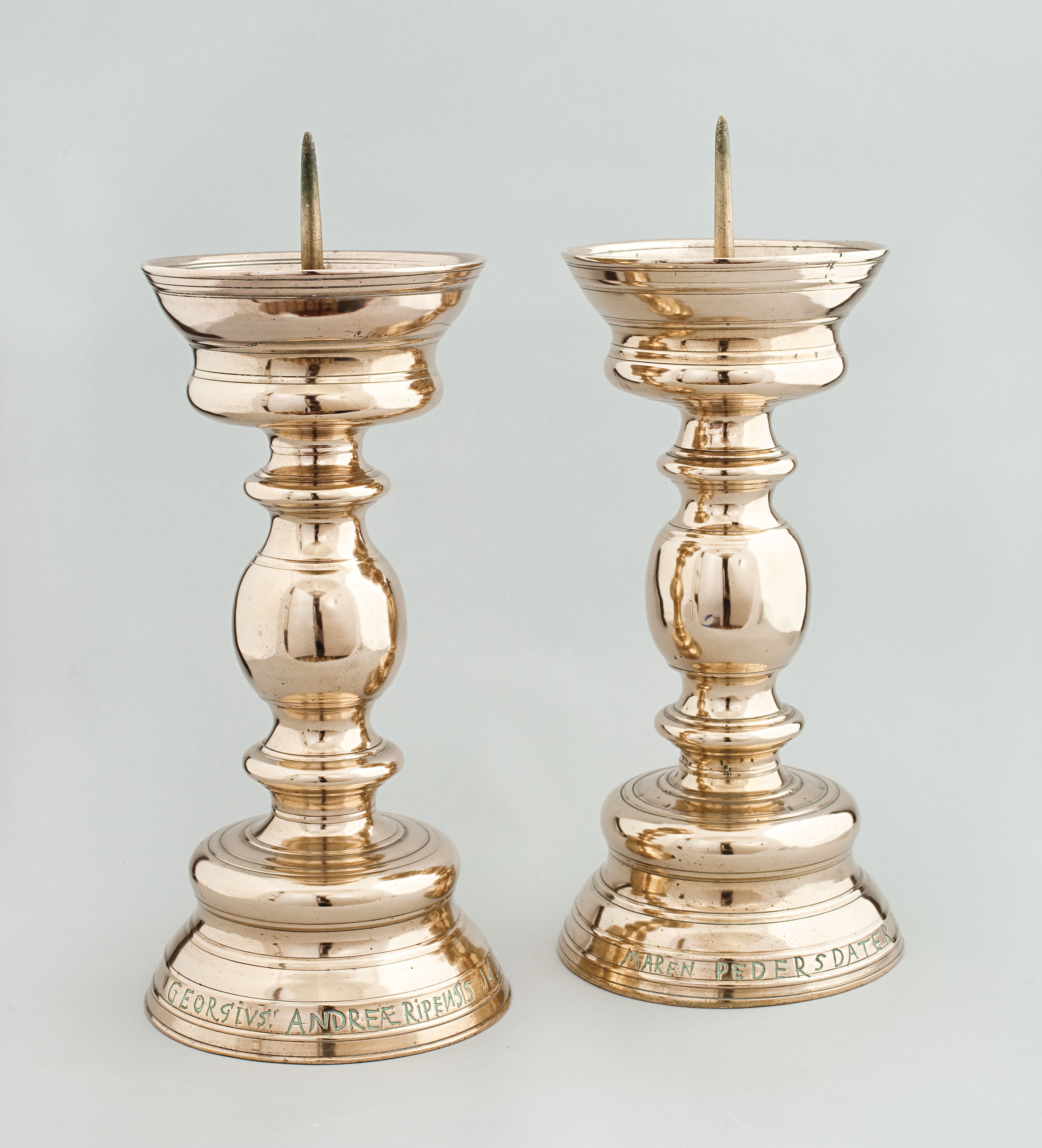 Danmarks Kirker, Ringkøbing Amt, Hæfte 14-15, fig. 25 Alterstager skænket i 1632 af sognepræst Jørgen Andersen Riber og hustruen Maren Pedersdatter.