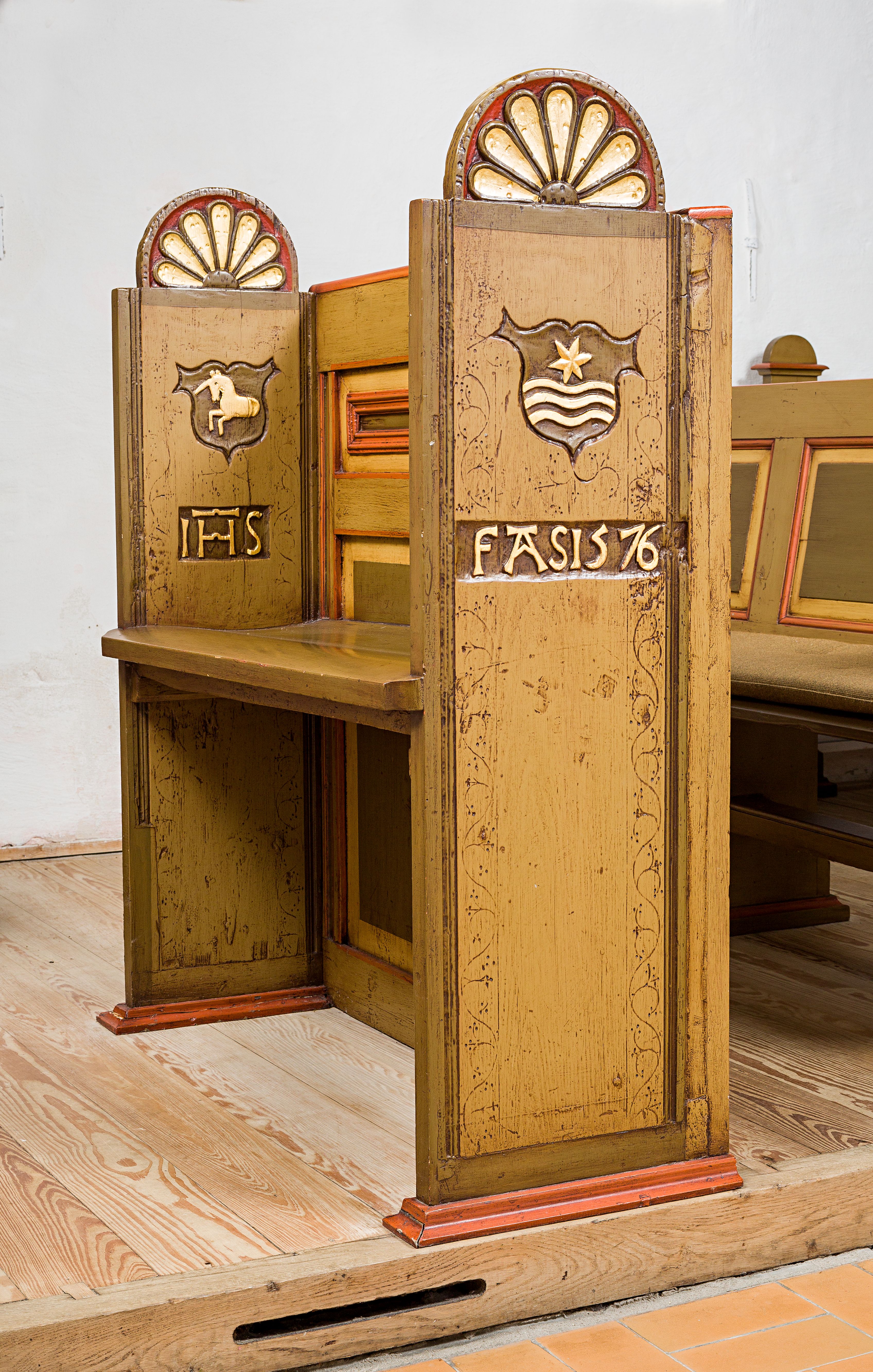 Gavle fra en (†)herskabsstol med årstal 1576 og våbener for Jens Juel til Alsted og hans hustru Anne Skram.