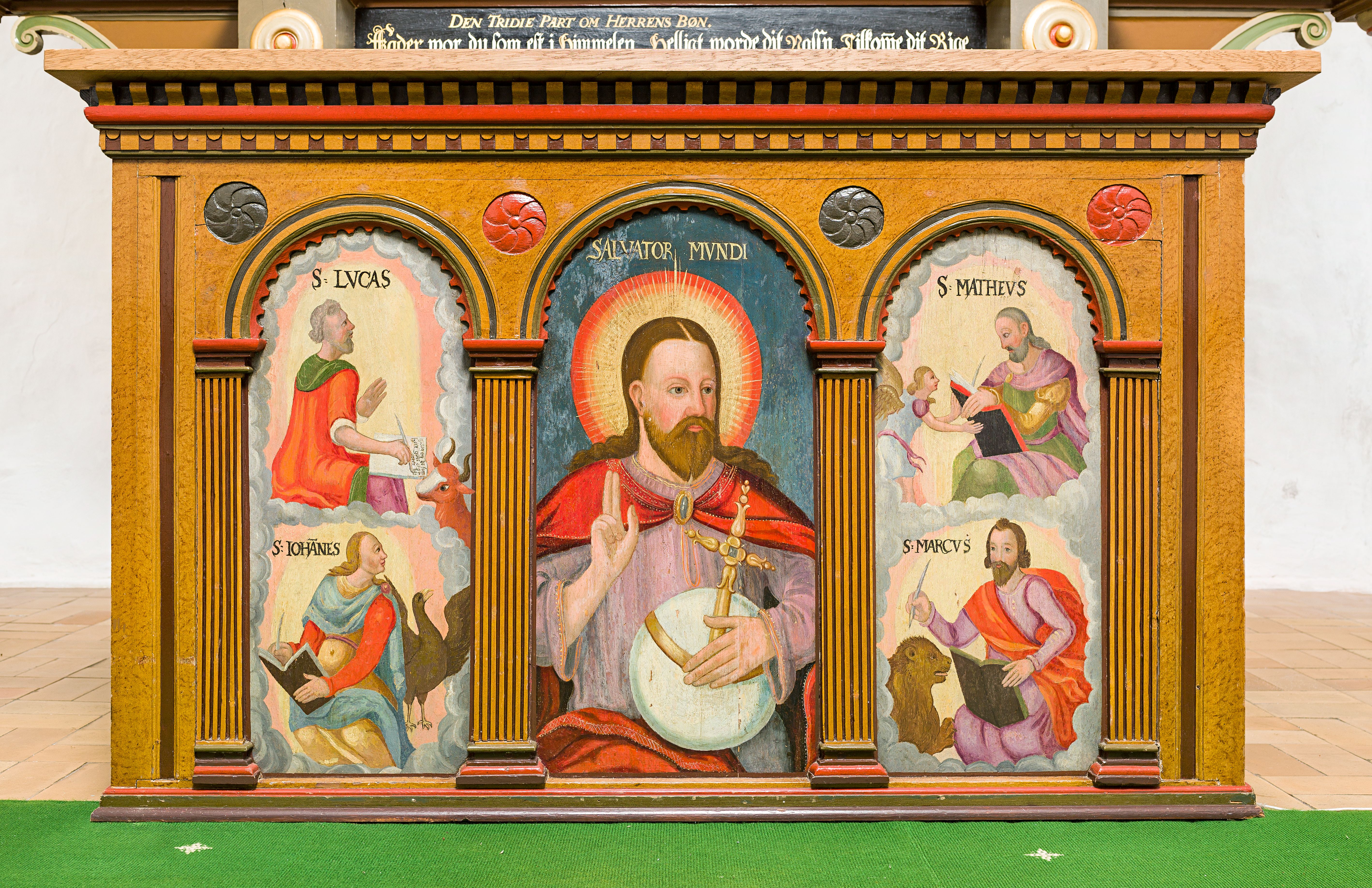 Alterbordsforside, 1615, 1600-tallet, skænket af Maren Skram til Fårup. DK Kirker, Vejle 22, 2504.