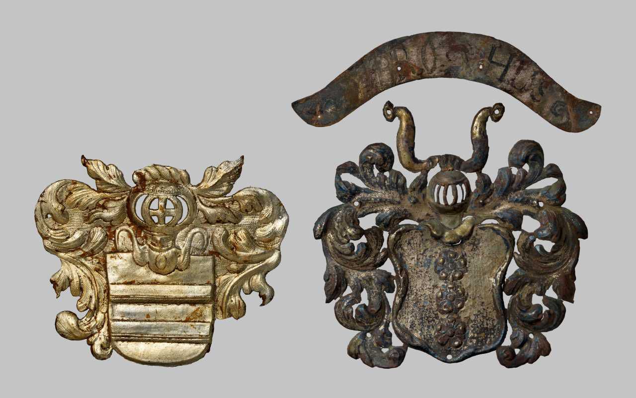 Våbenplader fra Sophie Amalie Bielkes kiste (findes ikke længere). Til venstre hendes eget våben, til højre anevåben for slægten Brockenhus. DK Kirker, Vejle 22, 2521.