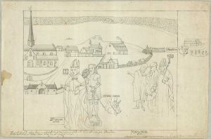 Tegnet af S.A. efter et gammelt beskadiget Malerie, mahlet med Liim Farve paa Bredder, hvilke afdeler en Krog i Sorø Kirke til et Repositorium. 24 x 35 cm.