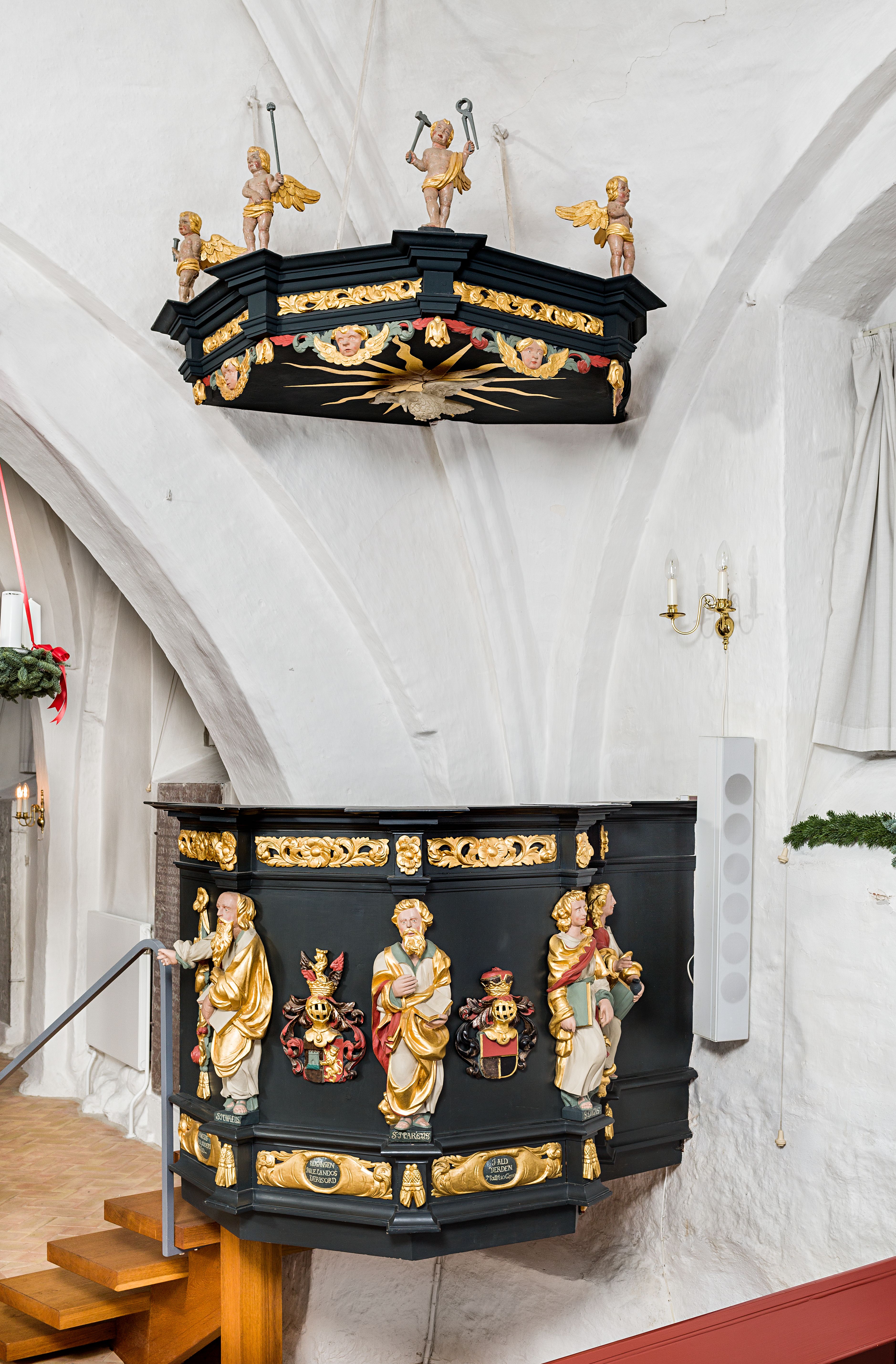 Prædikestol, skænket 1704, 1700-tallet, af Hans Brockenhuus von Løwenhielm og Ide Sophie Gersdorff. DK kirker, Odense 40-41, 4342