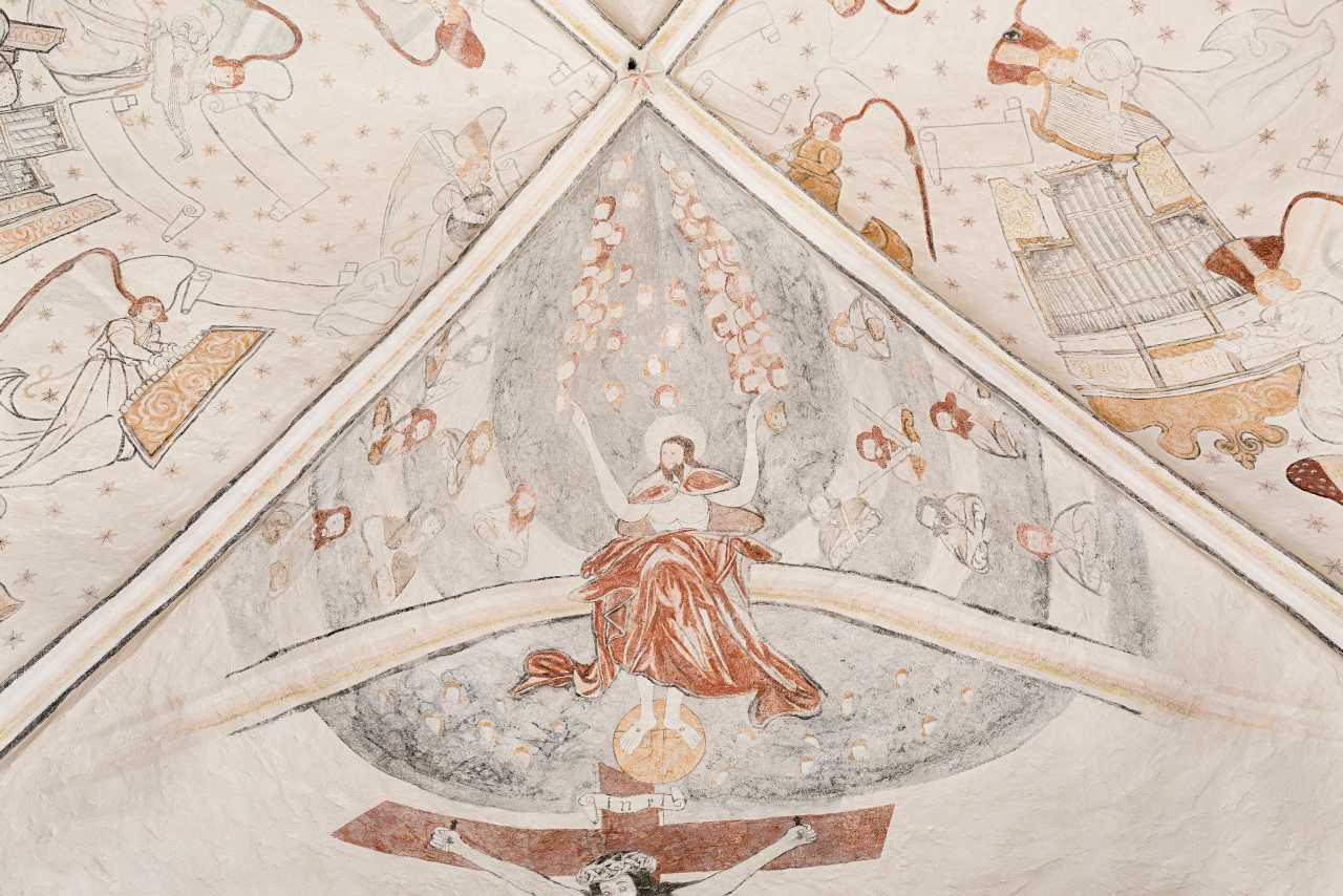Kalkmalet udsmykning, o. 1550-75, i kapelhvælvets østkappe, Rynkeby Kirke.