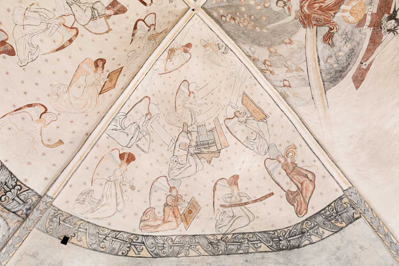 Kalkmalet udsmykning, o. 1550-75, i kapelhvælvets nordkappe, Rynkeby Kirke.