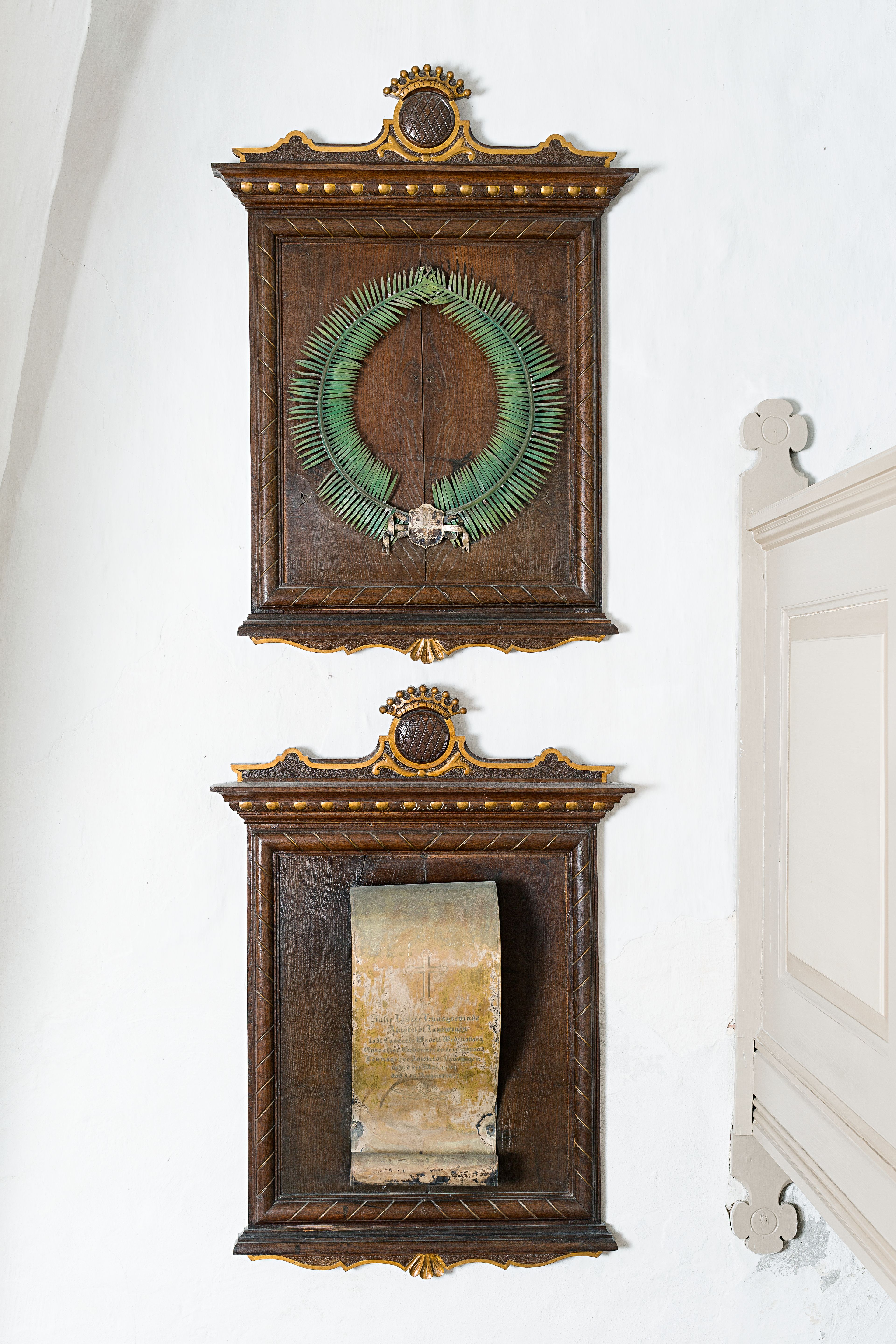 Mindetavle og palmeblade over Julie Louise, lensgrevinde Ahlefeldt Laurvig, o. 1877, Revninge Kirke.