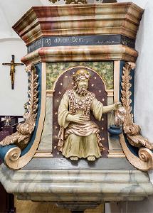 Melkizedek, udsnit af prædikestol, Bredsten Kirke.