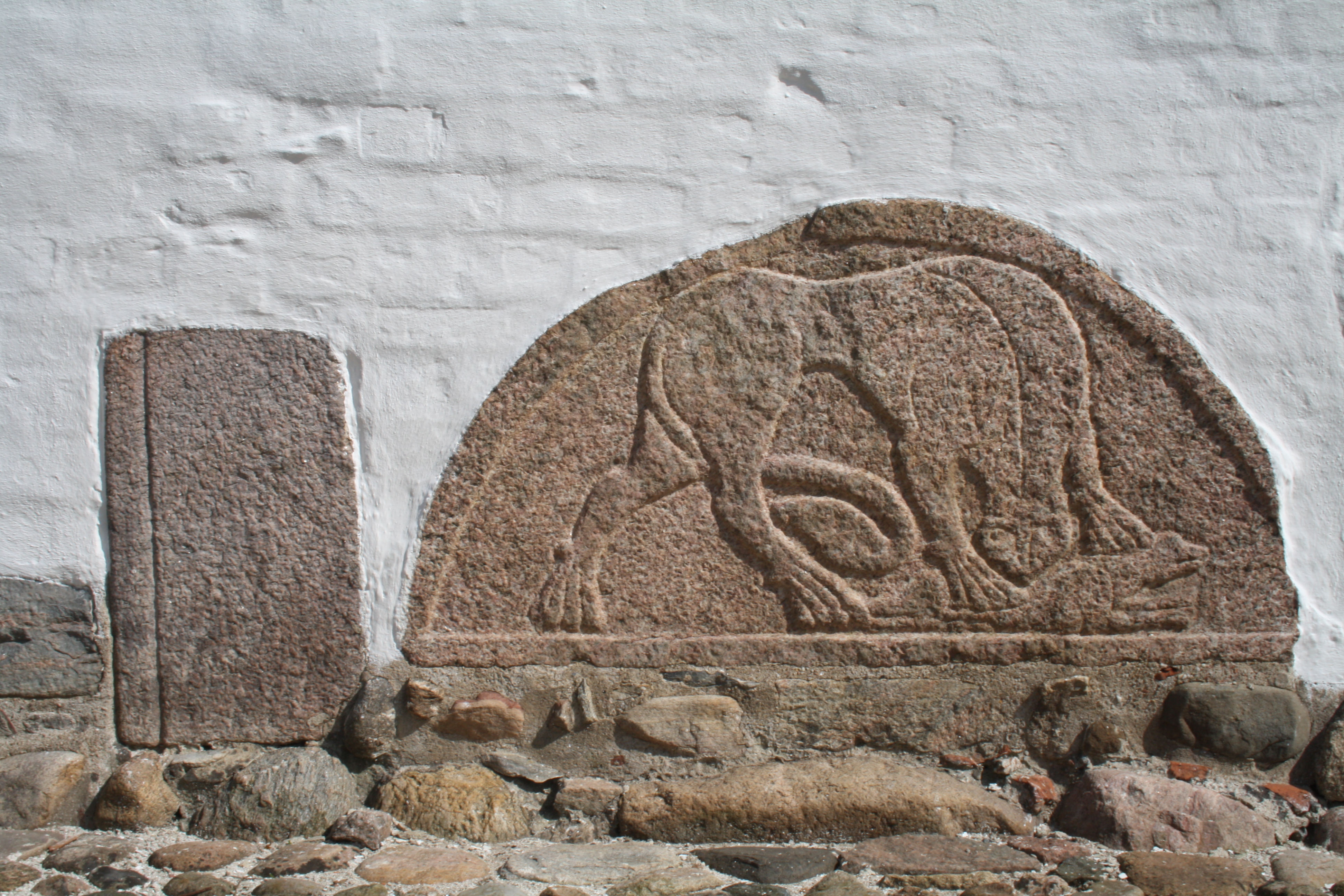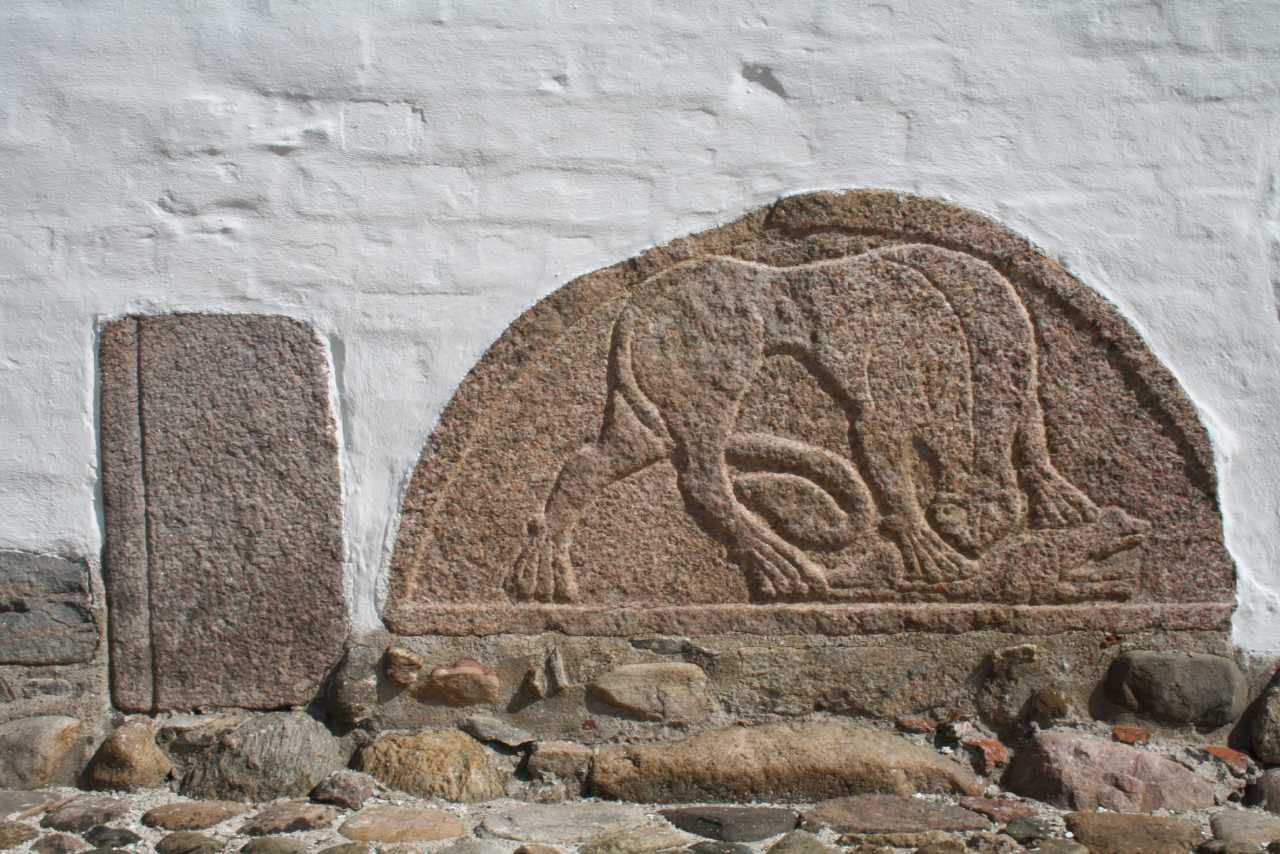 Sokkelsten og tympanon i vestgavlen, Skibet Kirke.