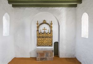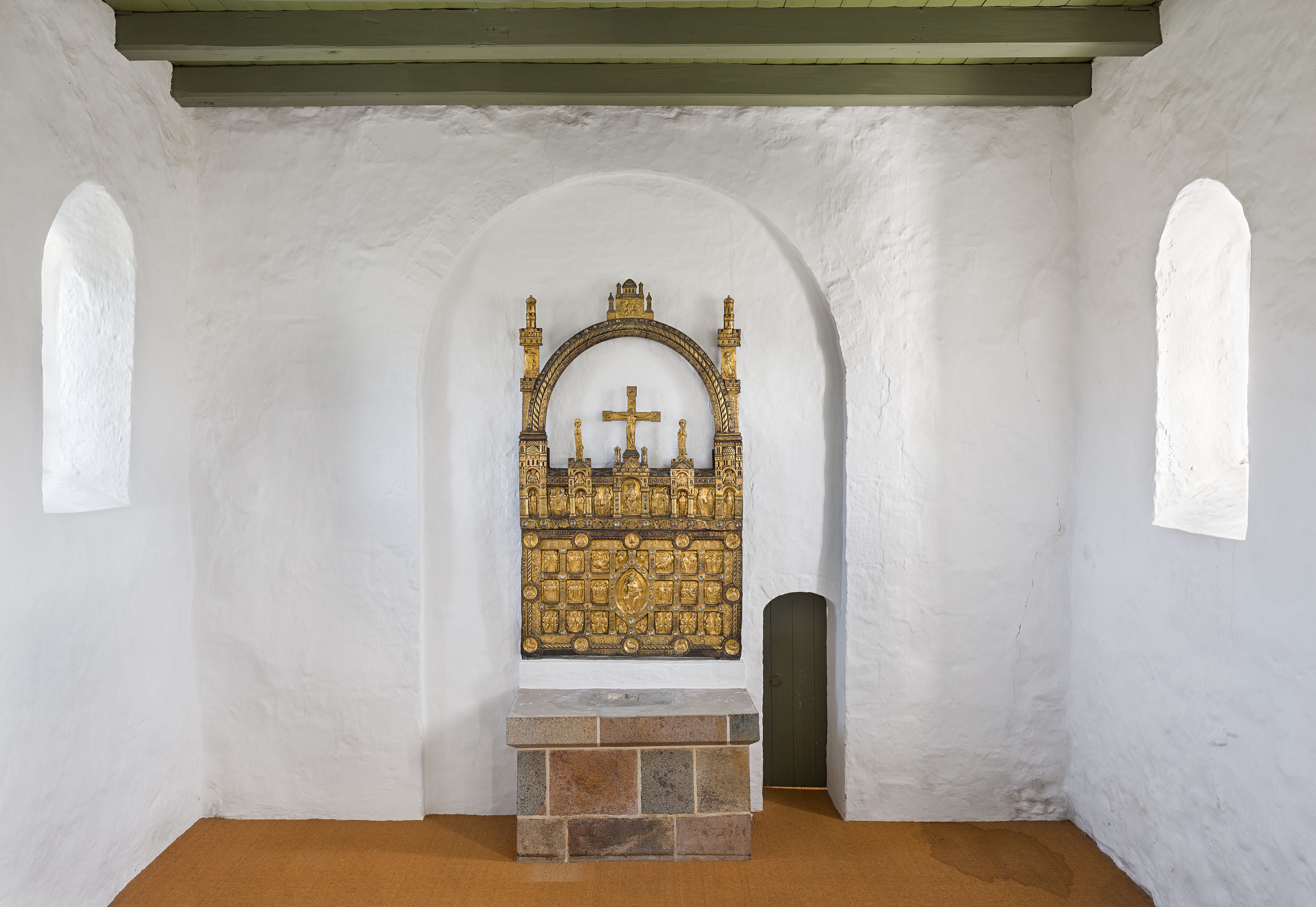 Korets østparti med det gyldne alter, o. 1200, opsat foran den senmiddelalderlige lukkemur og ved døren til sakristiet, Sahl Kirke.