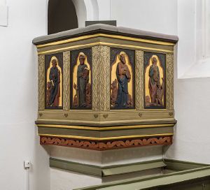 Med evangelistrelieffer, skåret af Lambert Petersen, København. Litteratur: Danmarks Kirker, Ringkøbing Amt, hæfte 27-28, 2018, s. 2927.