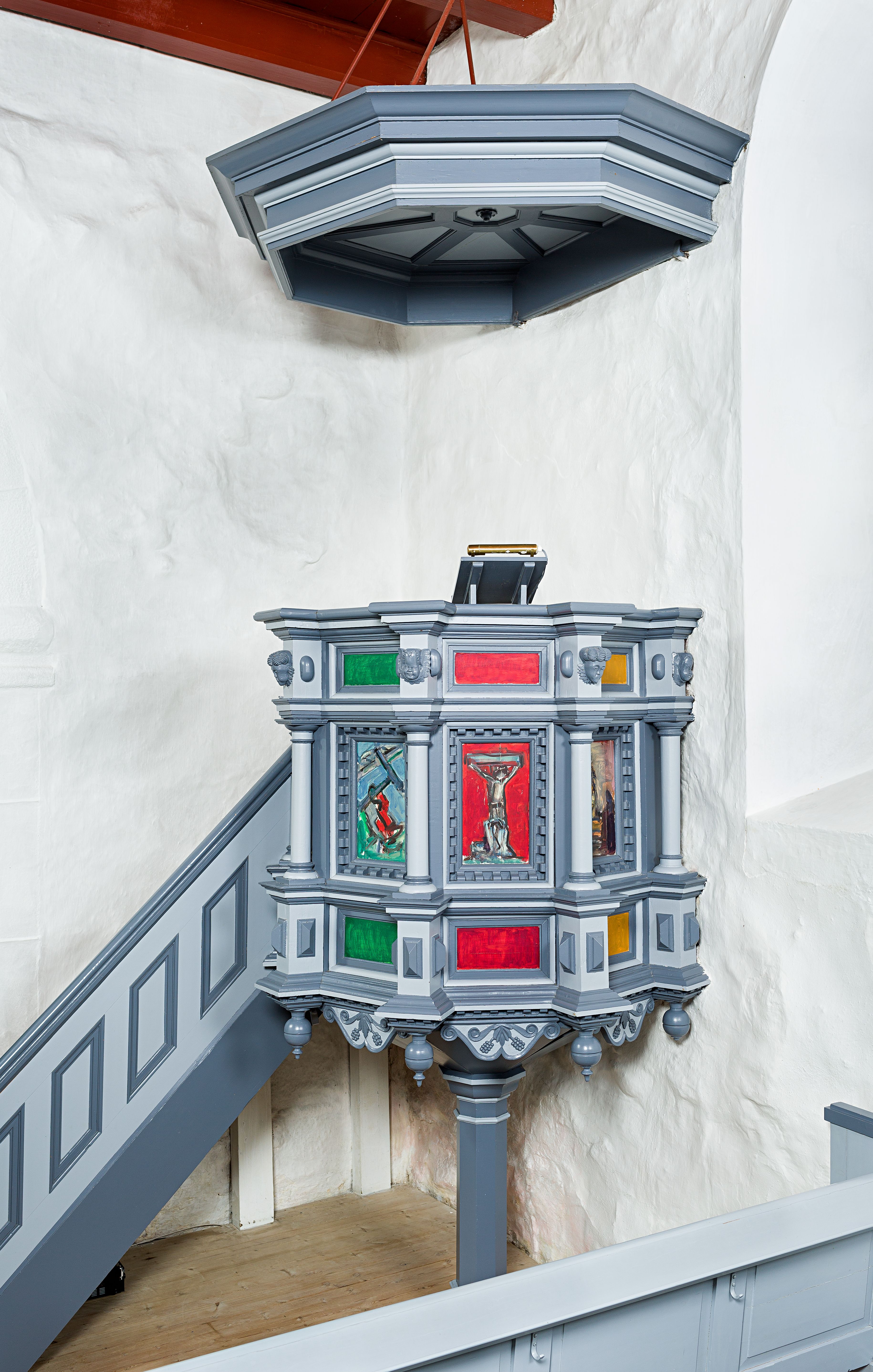 Prædikestol, 1600-tallets begyndelse med malerier fra 1986. Navr Kirke