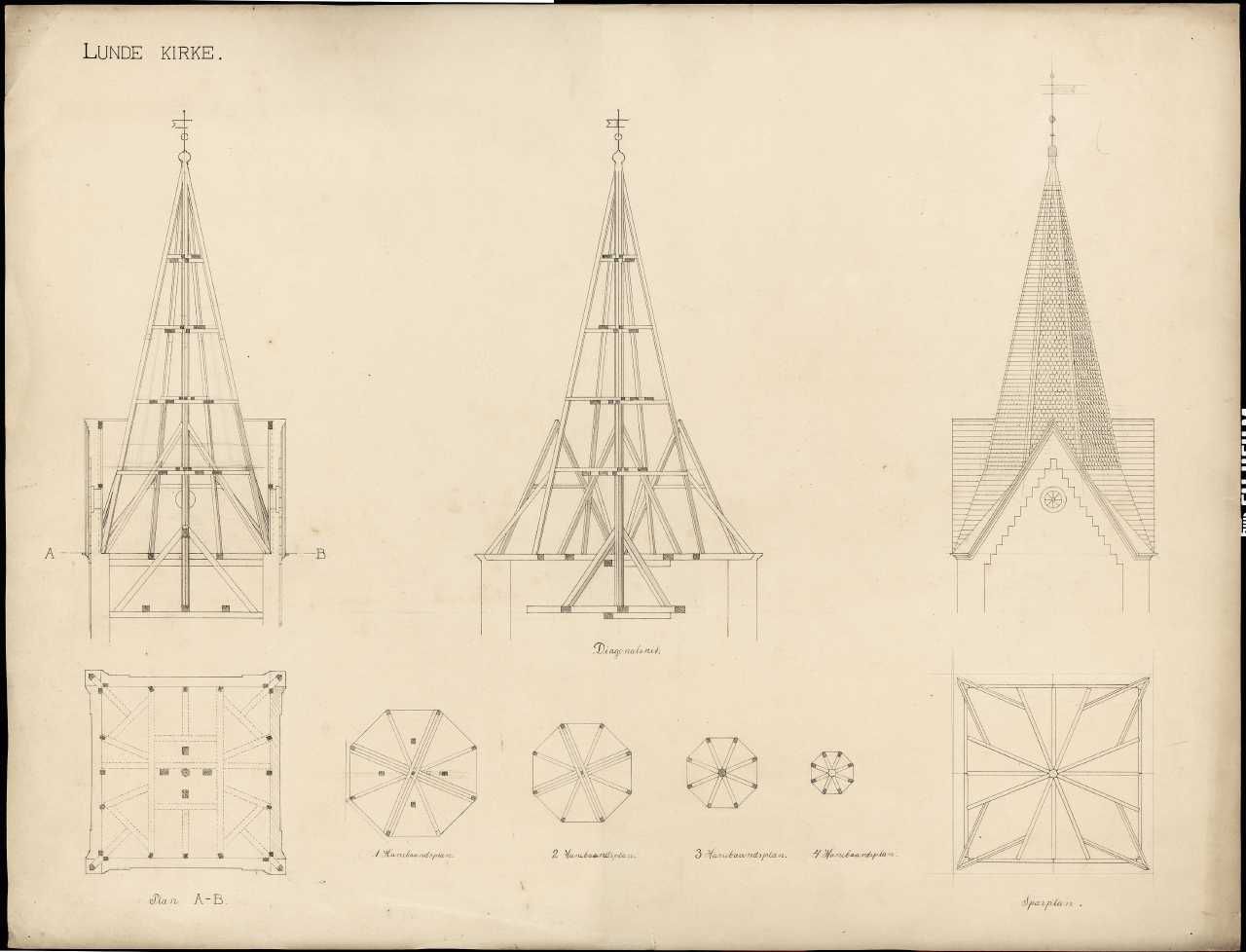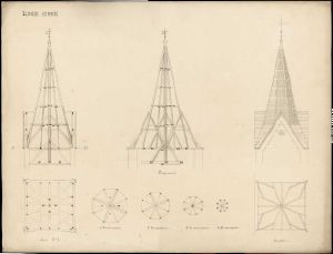 Konstruktion af tårnets spir, 1:300, Lunde Kirke