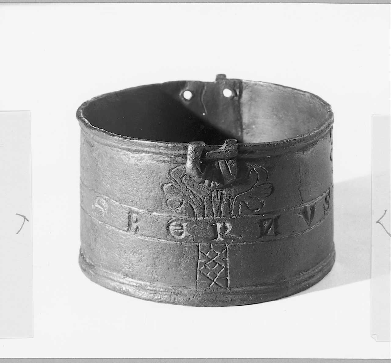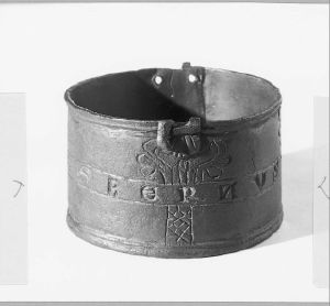 Oblatæske o. 1250, signeret af "Esbernvs Benedi(cti)", d. e. Esben Bendtsen. I Horsens Museum (HOM 1x9412). DK Århus, 6445, fig. 1.