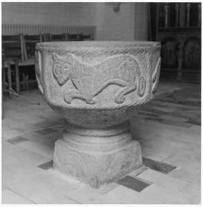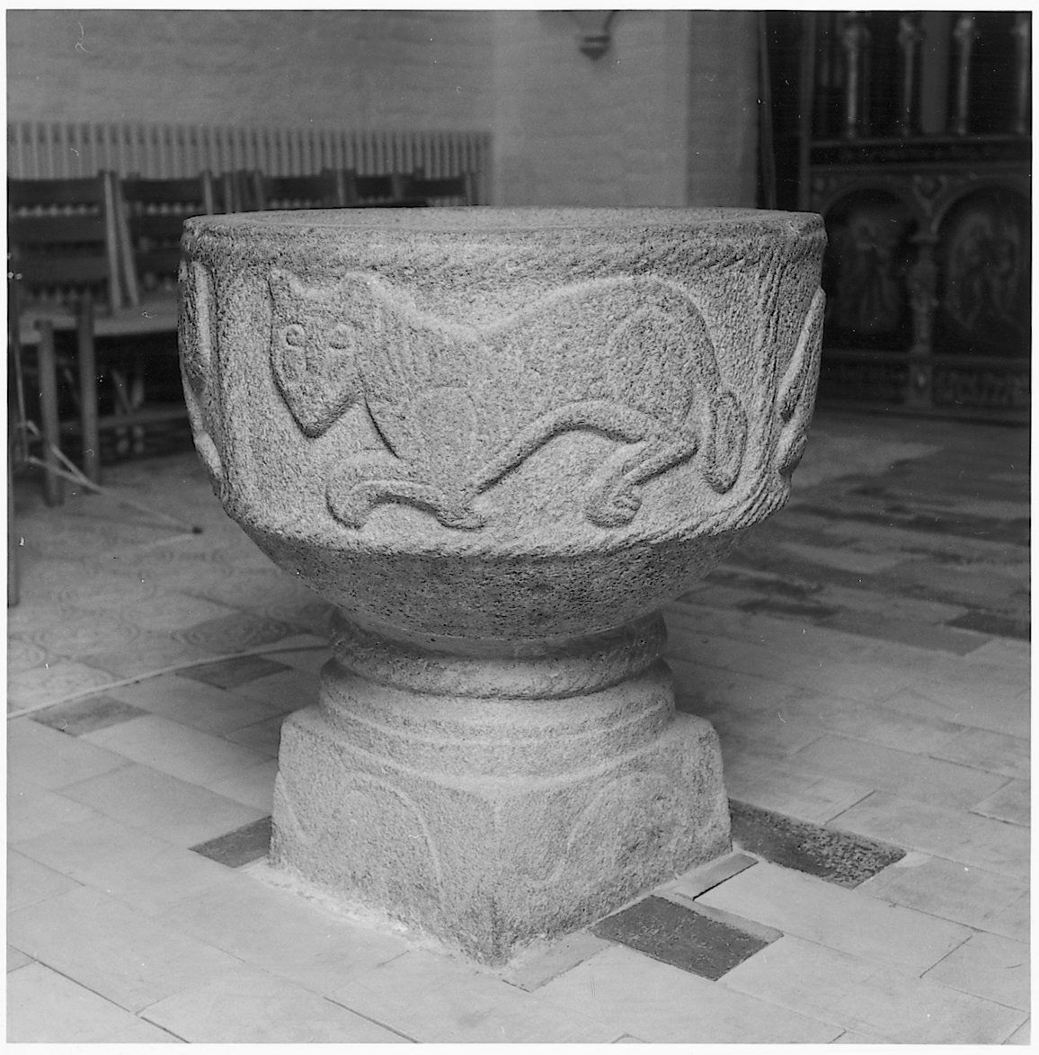 Romansk granitfont, tilhørende den såkaldte Horsenstype af de østjyske løvefonte. DK Aarhus 58-60.