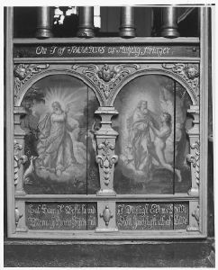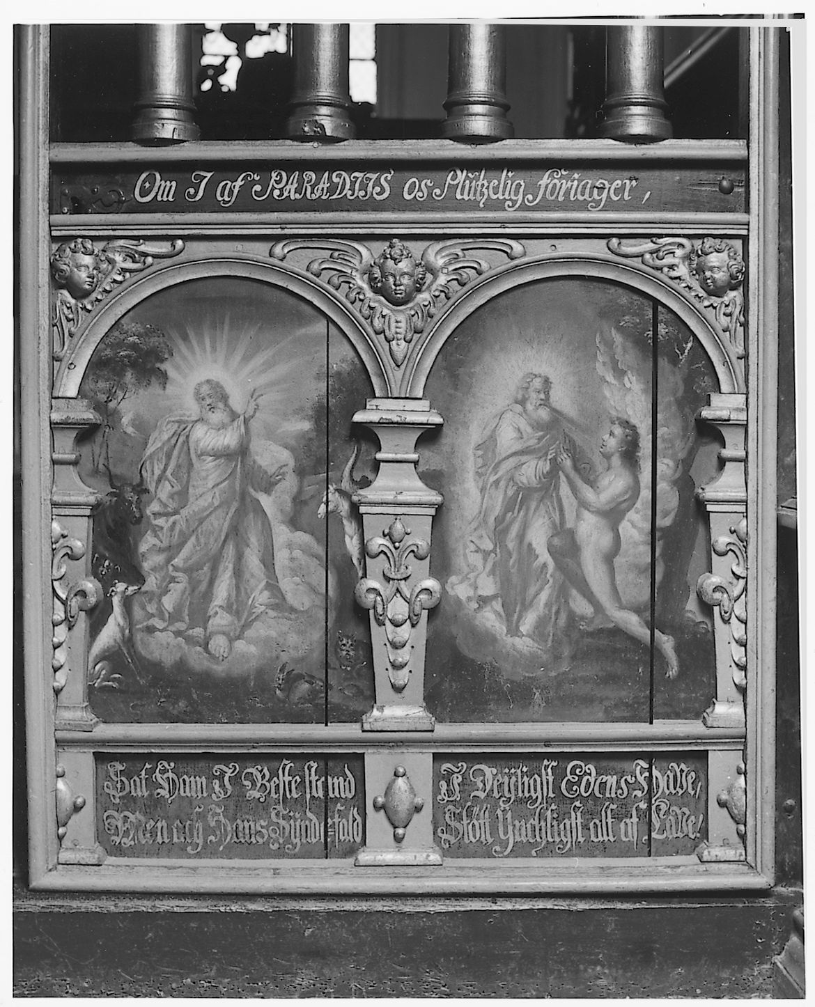Detaljer af korgitterets malerier, tilskrevet Hans Christian Wilrich. Gud skaber jordens dyr og Adam. DK Aarhus 5805, fig. 184.