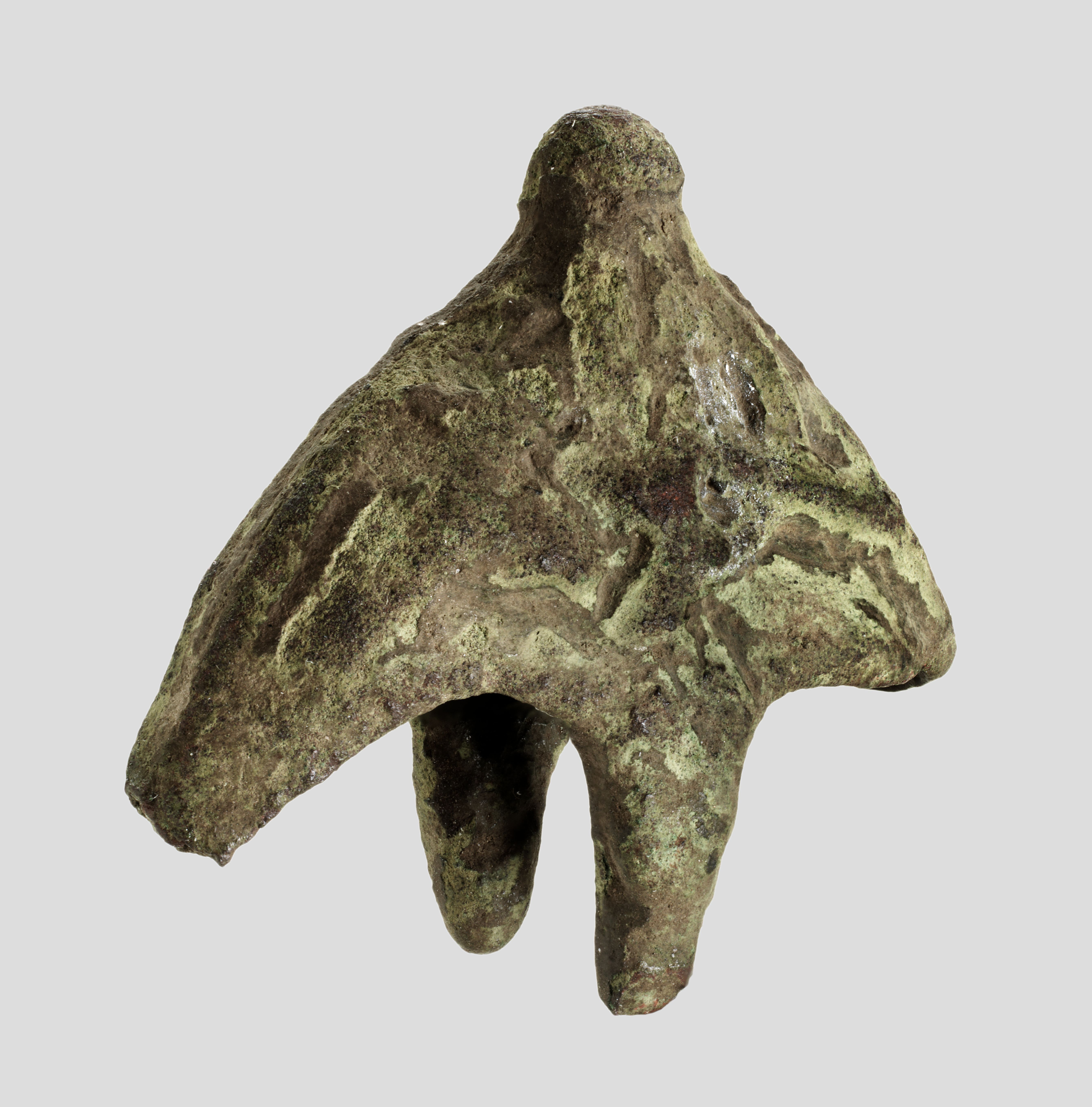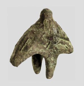 Dupsko af støbt bronze med tre flige opadtil (den ene side er knækket af) og en tap ved bunden. Begge sider er ornamenteret med et fletværksmotiv. Fra tidlig middelalder.