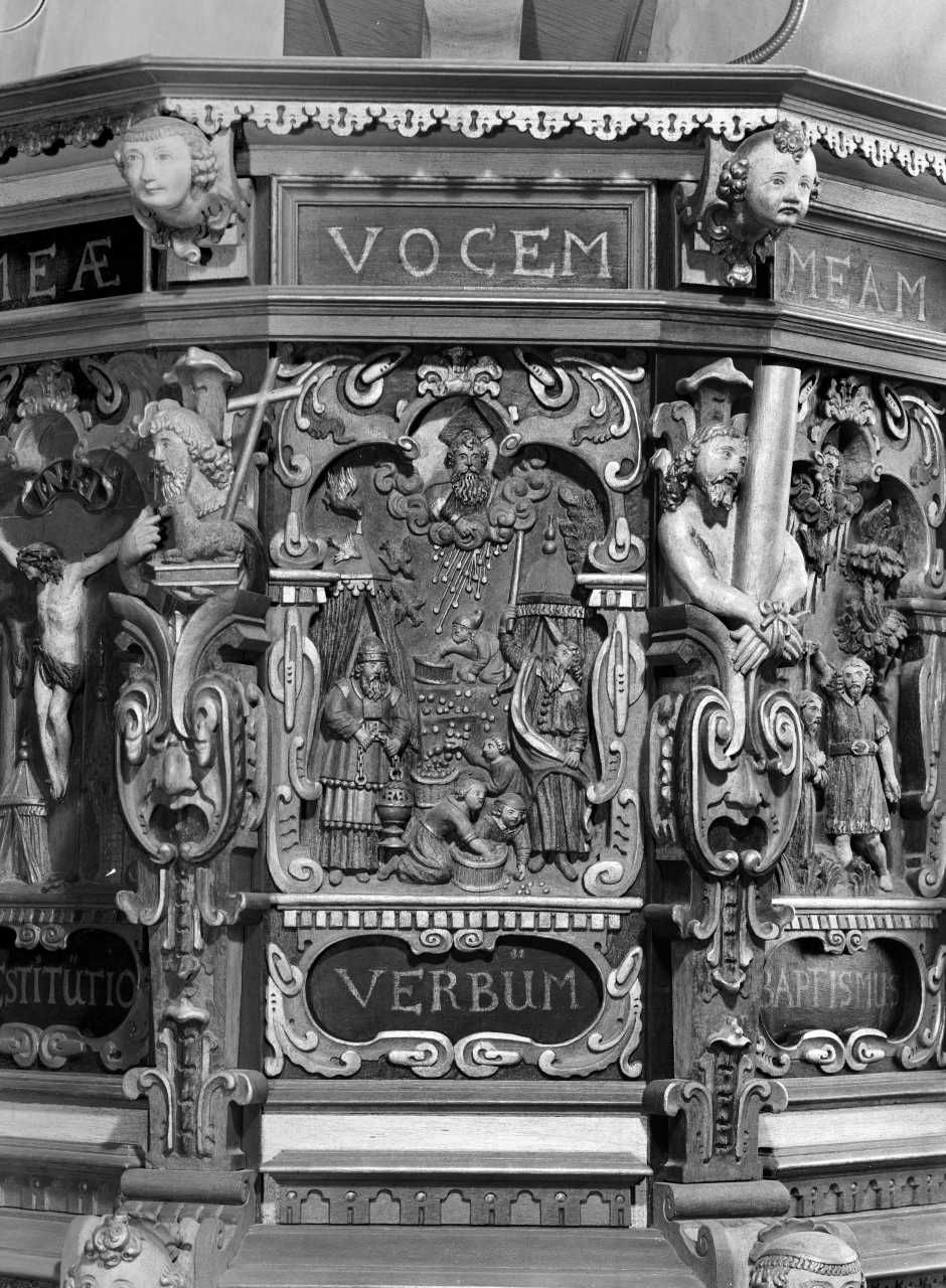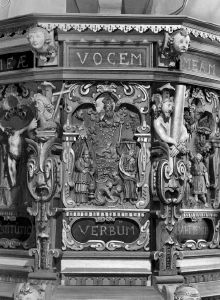Detalje af prædikestol. Prædikestolen, har malet årstal 1656 på himlen, en datering, der bekræftes af topstykkernes reliefskårne våbener for Frederik III, Christopher Urne (lensmand på Dragsholm 1645-58) og dennes hustru, Sophie Lindenow. Selve stolen er udført i Lorentz Jørgensens værksted, mens opgang og løbebro stammer fra tiden o. 1600 og står med yngre malerier, udført samtidig med prædikestolen eller muligvis først i 1700’rne.