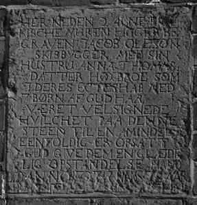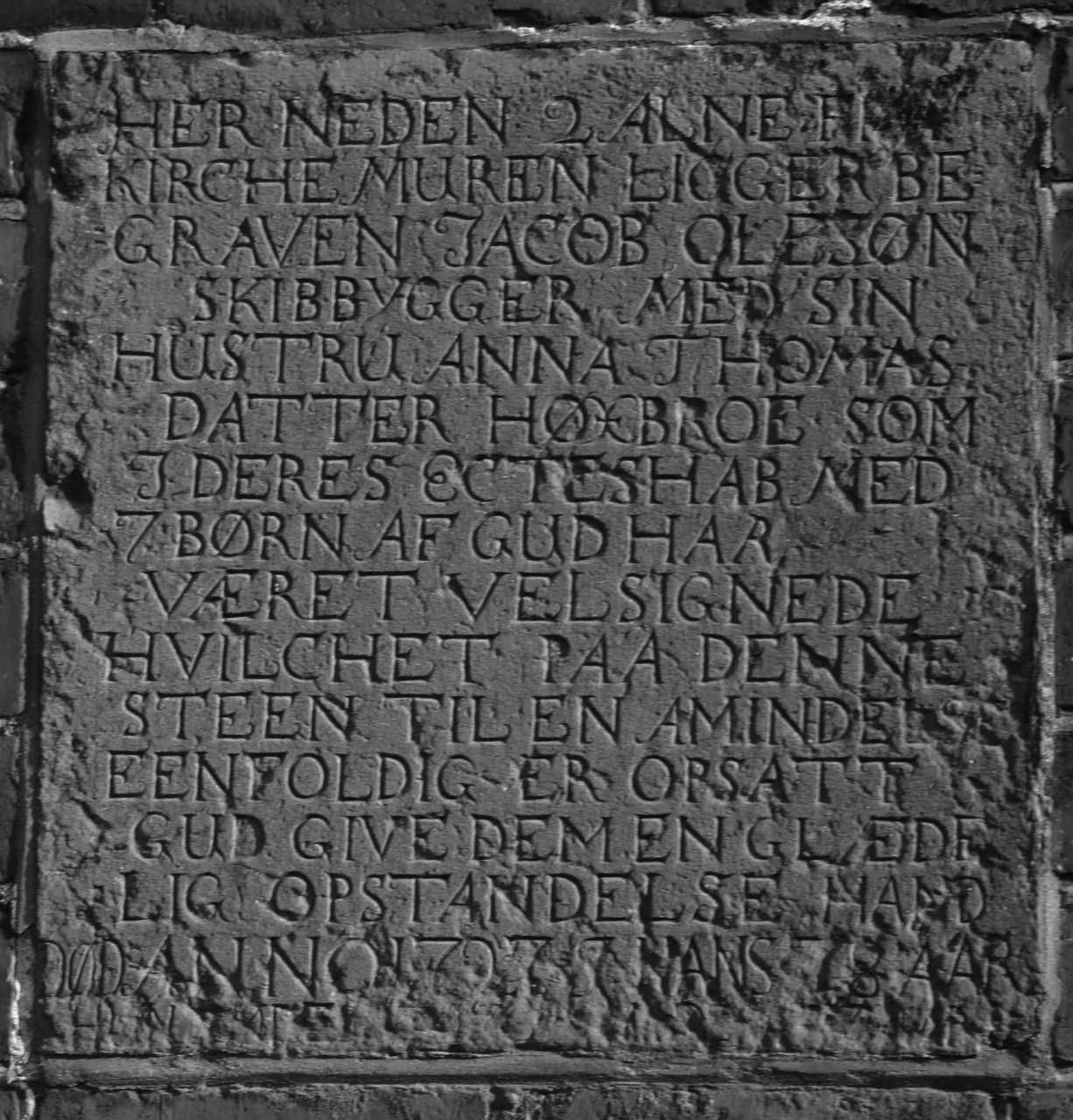 Kirkegårdsmonument, o. 1727, over skibsbygger Jacob Olesen (†1727) og hustru Anna Thomasdatter Høgsbro (†1727). DK Aarhus 5973, fig. 462.