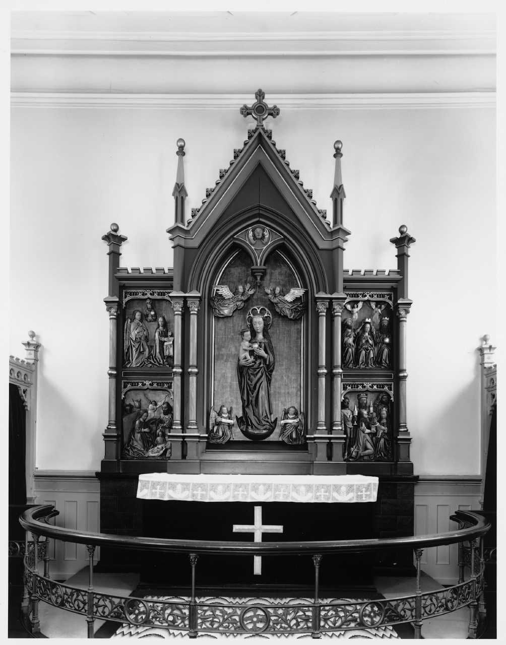 Altertavle 1869 med relieffer og andet snitværk fra en sengotisk Maria-altertavle, o. 1500. DK Aarhus 6069, fig. 10.