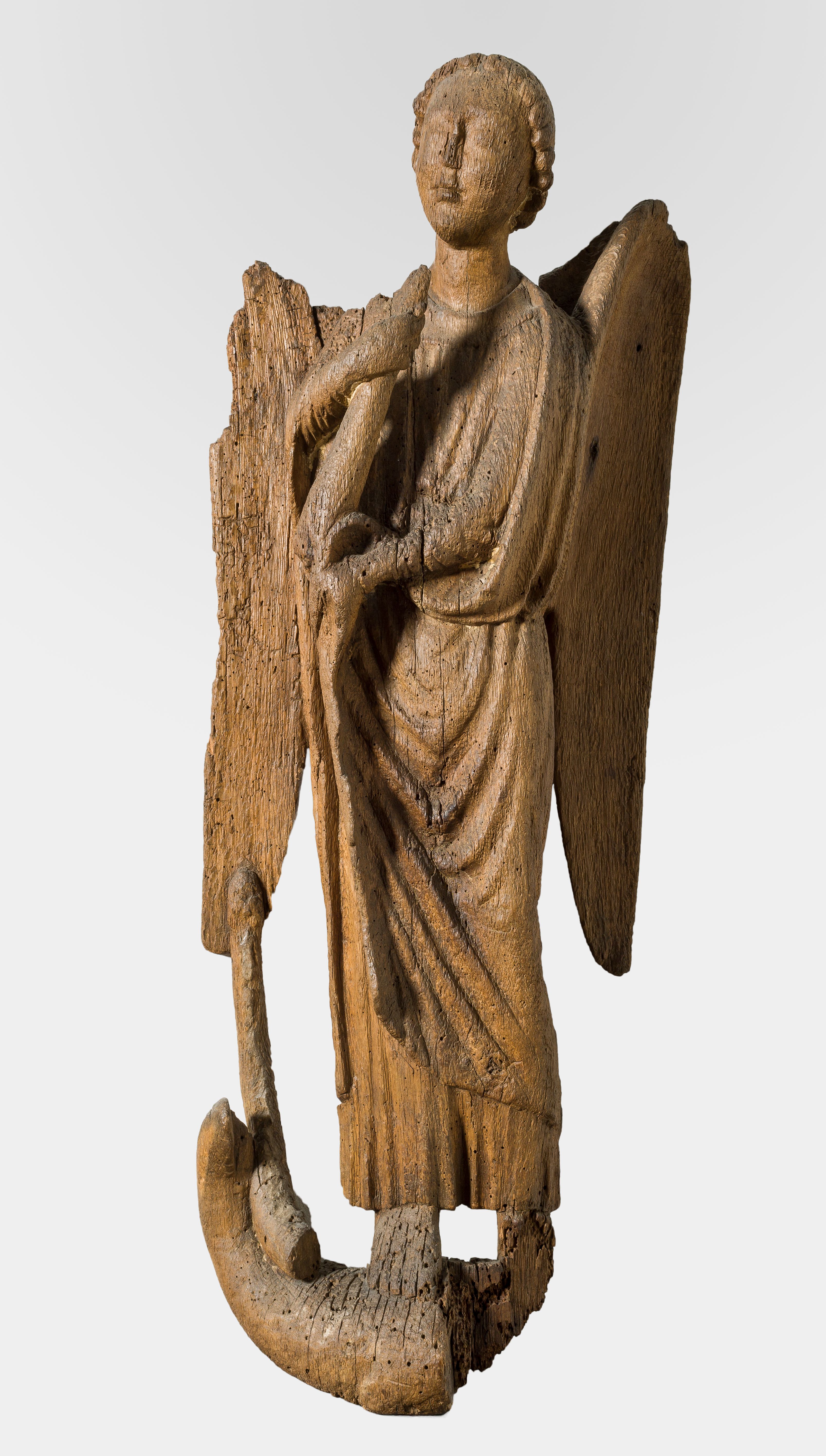 Udskåret figur af eg, fra o. 1250, der forestiller ærkeenglen Michael med dommedagsbasun, der træder dragen under fode.