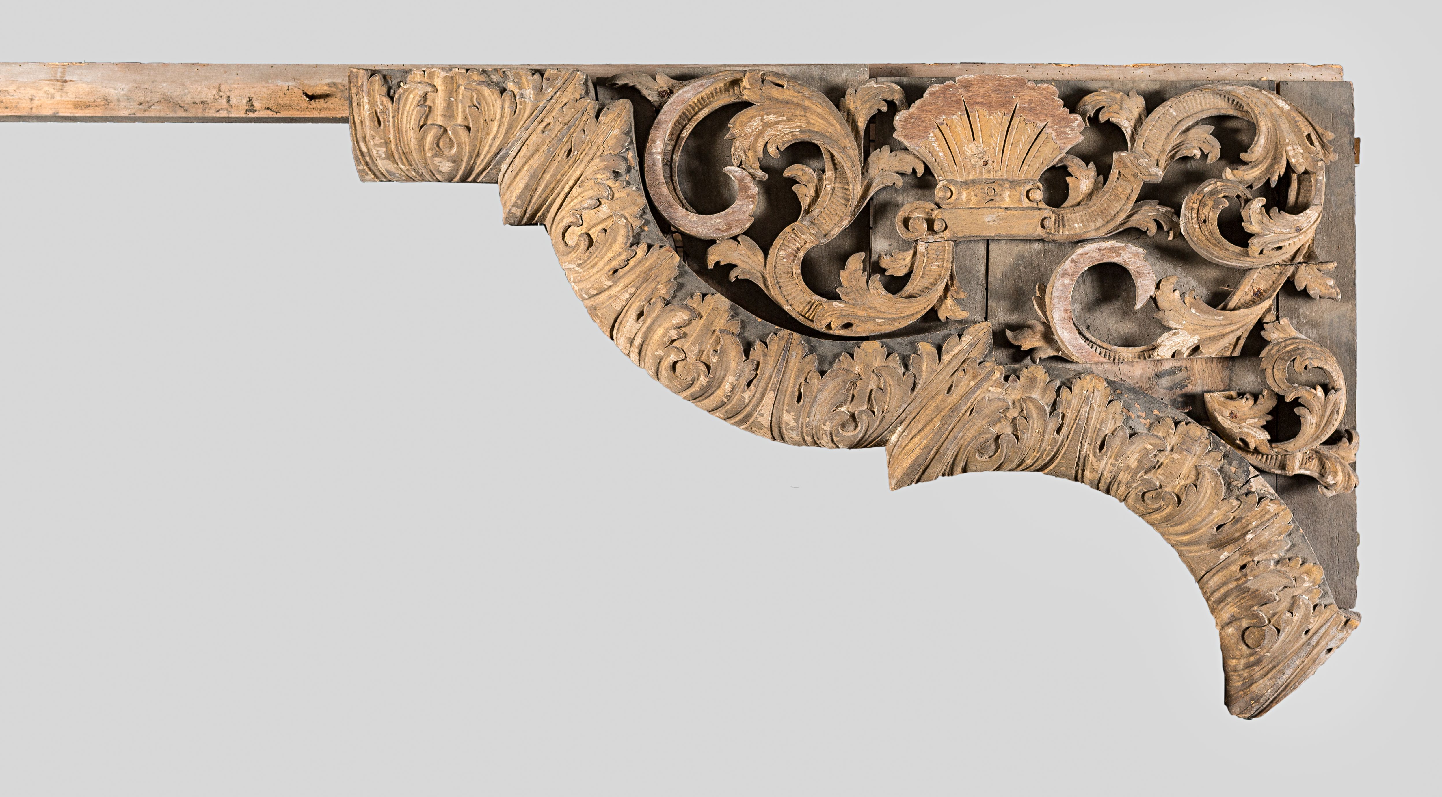 Udskåret ramme, akantusbarok, antageligt den øvre del af den forsvundne ramme fra storstykket i Michael Tuischs altertavle 1717 i Odense Skt. Hans Kirke (DK Odense s. 1348), sml. DK Odense 1352 fig. 126. I Odense Bys Museer (inv.nr. KMO/1895/33g).