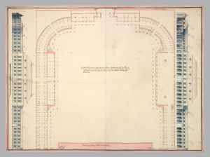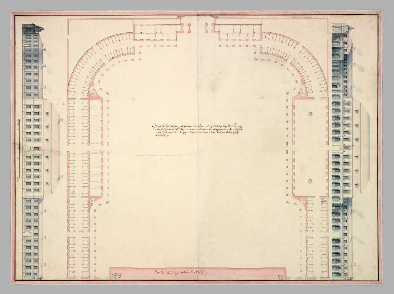 København, Christiansborg, Ridebanen. Plan og opstalter, usign. og udat. med tekst. Pen og akvarel. 71x96 cm.