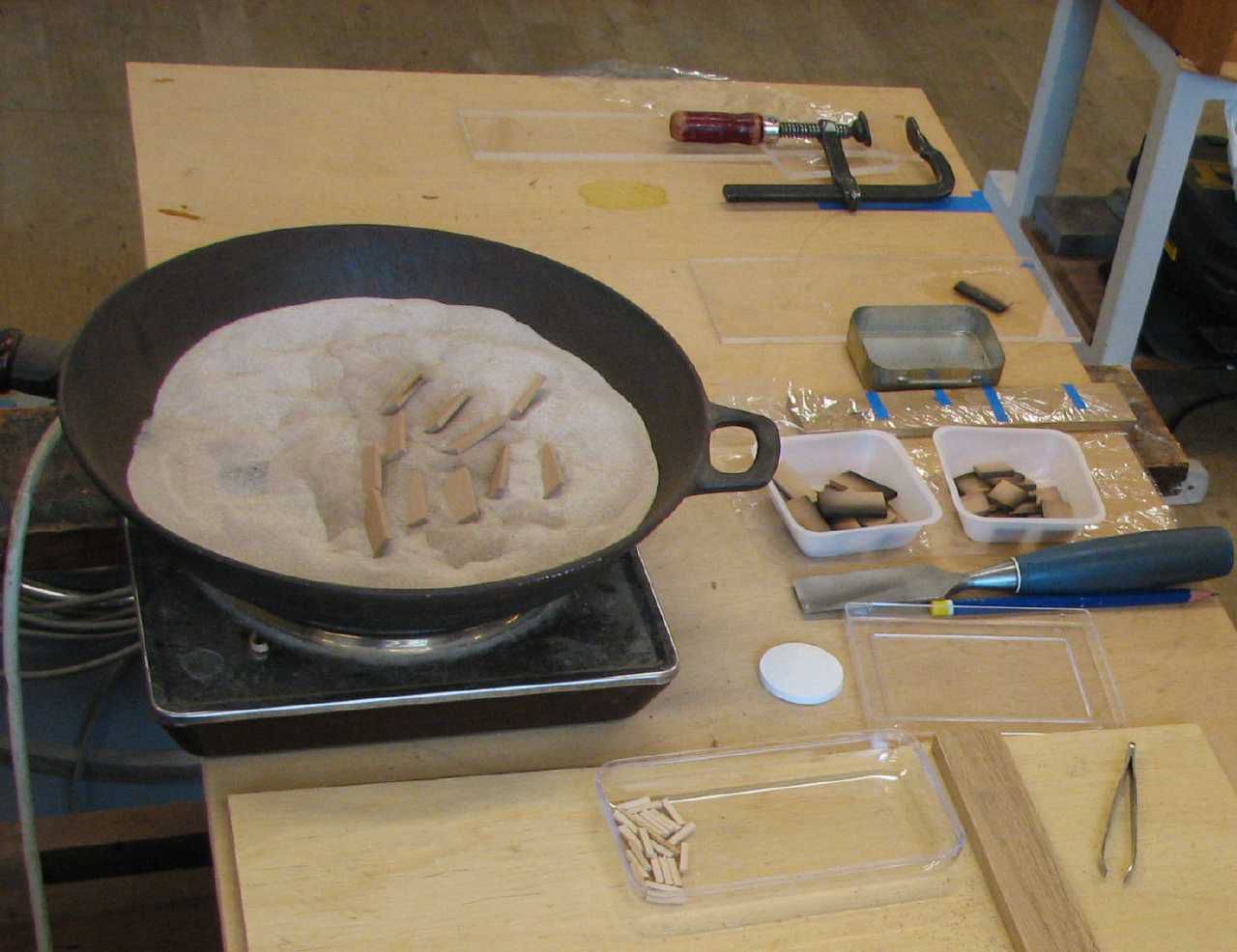 Vejby Kirke. Opvarmning af finer i sand, for at opnå skyggevirkning.