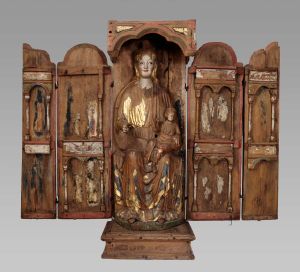 Bemalet fyrretræ med en flere mm tyk kridtgrund. Den nuværende bemaling synes ikke at være oprindelig.