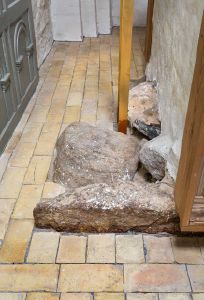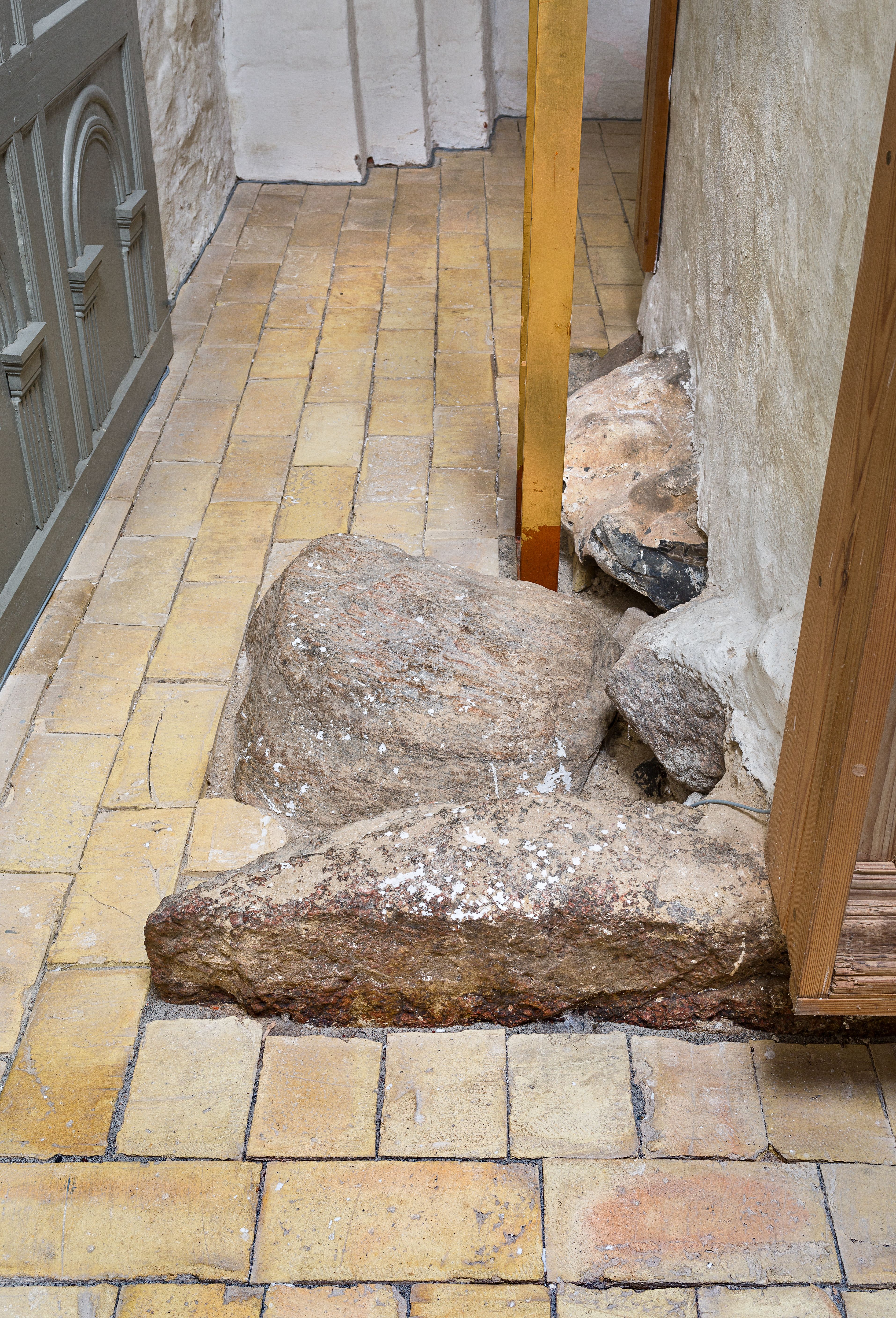 Fundamentsten til det middelalderlige alterbord. Litteratur: Danmarks Kirker, Odense Amt, hæfte 47, 2019, s. 5354.