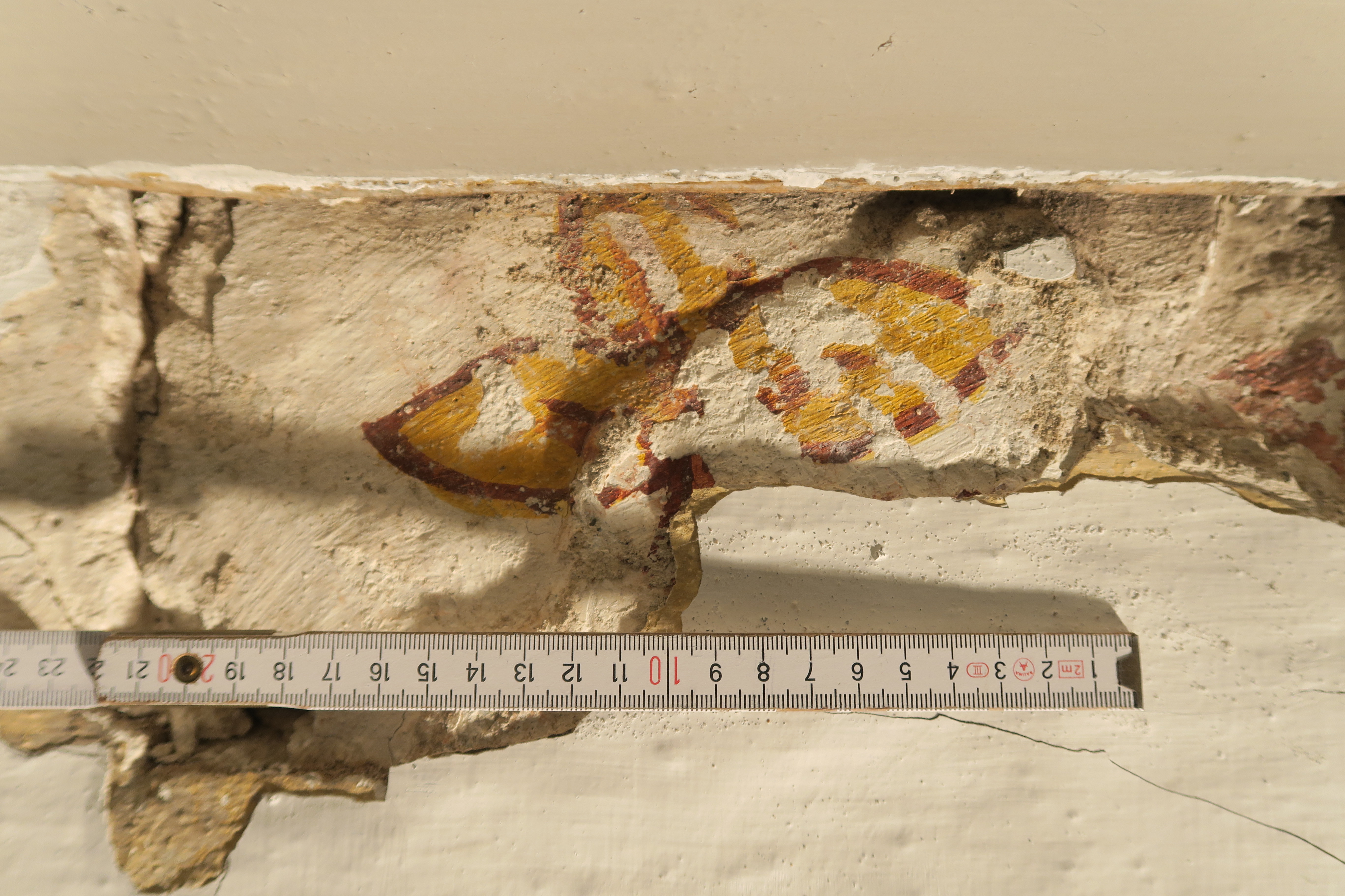 Registrering af kalkmaleri. Skibets syd og vestlige mur.