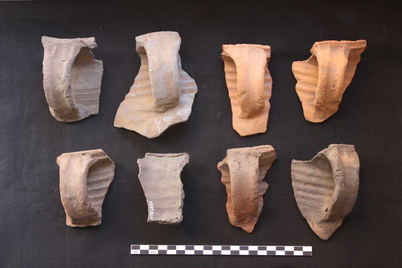 Skår 25-32. 32 båndformede hanke fra Farum Lillevangs kuglepotter.